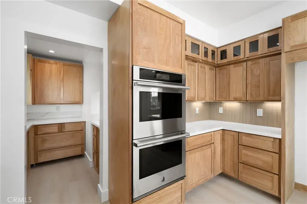 The kitchen is both elegant and functional, featuring double wall ovens, a six-burner gas cooktop with pot filler, quartz countertops, bar seating, custom cabinetry, and an oversized sink with professional-style faucet. A thoughtfully designed butler’s pantry provides additional counter space and storage, with room for small appliances and a wine fridge.