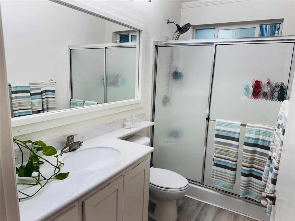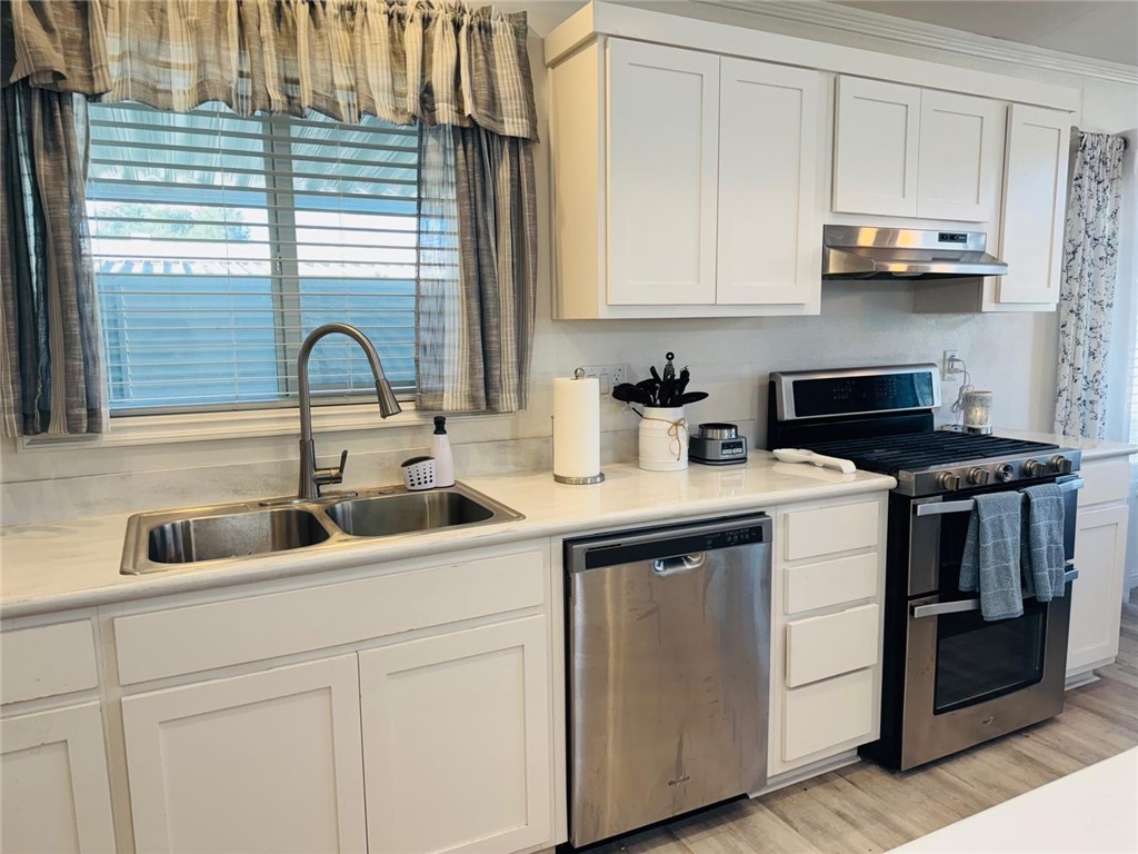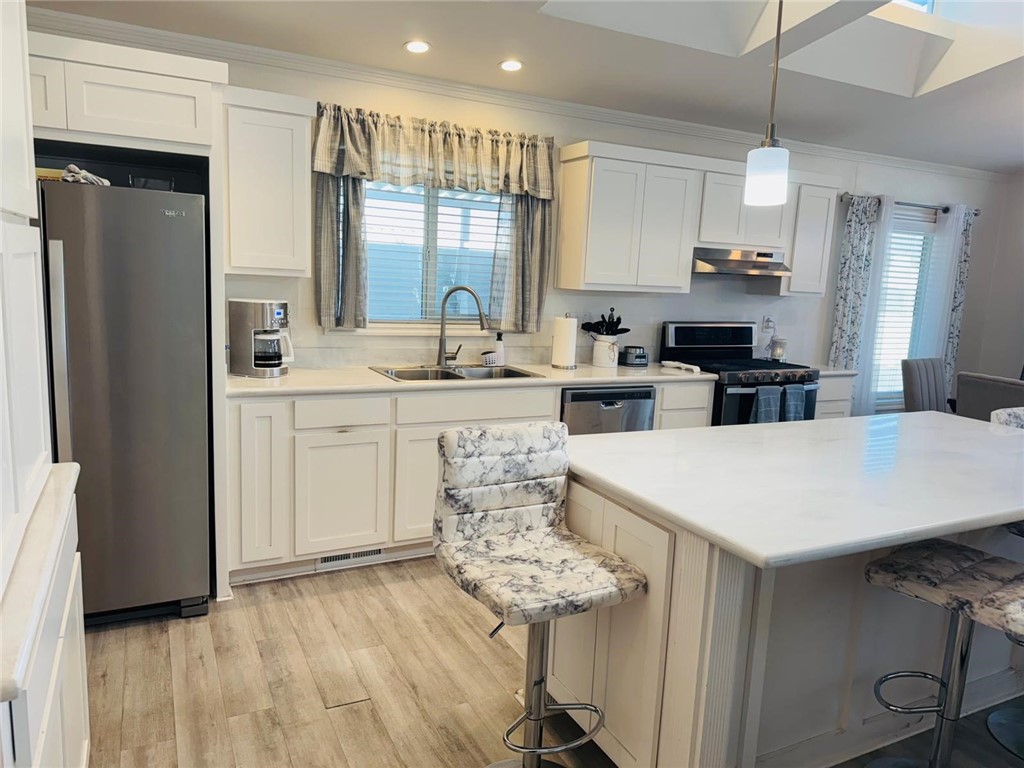 The well-appointed kitchen is both functional and stylish, boasting Corian countertops, stainless steel appliances, a double gas oven range, dishwasher, double-door refrigerator, and garbage disposal. Year-round comfort is assured with central air conditioning and heating, plus cordless ceiling fans in every room.