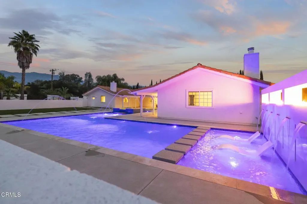 Exceptional gated Ojai compound with four independent structures, and a resort-style pool courtyard on 1.41 private acres. Designed as a true multi-structure estate, the property spans four separate buildings making it ideal for multi-generational living, creative use, or boutique retreat potential. The resort-style pool courtyard anchors the estate and delivers that private resort experience with an approximately 40-foot pool, dual Baja shelves, six waterfalls, a dramatic 20-foot fire wall, an inset spa, and a glow-in-the-dark pathway, all surrounded by new luxury turf and is visible from much of the main residence. The over 4,000-sq-ft main home features 6 bedrooms and 6 bathrooms with high ceilings, abundant natural light, and seamless indoor-outdoor flow, along with an attached mother-in-law suite offering its own private exterior entrance for added independence. A discreet concrete ramp serves the rear primary suite, providing elegant accessibility without compromising design. A separate 3-bedroom, 1-bath guest house includes its own gated street entrance, open kitchen, exterior laundry, fenced yard with turf, and a mini-split HVAC system for individualized year-round comfort. Two additional structures were used for family members with each having private entrances, fenced yards, and mini-split systems, making them ideal for home offices, studios, family or visiting friends. Mature fruit trees are scattered throughout the grounds, while a large open central area creates natural separation between structures and offers future possibilities such as gardens, recreation space, additional parking, or expansion. This rare Ojai retreat blends privacy, versatility, and long-term potential, offering a compound-style layout designed to support the way you live today while leaving room to grow tomorrow.