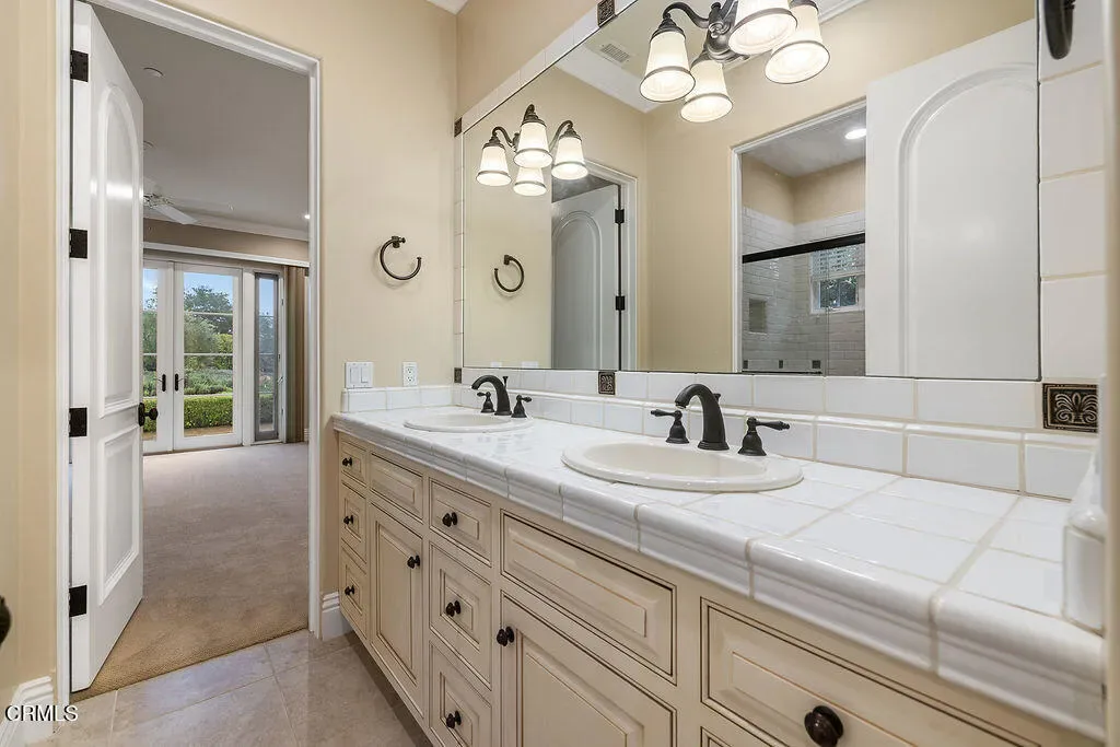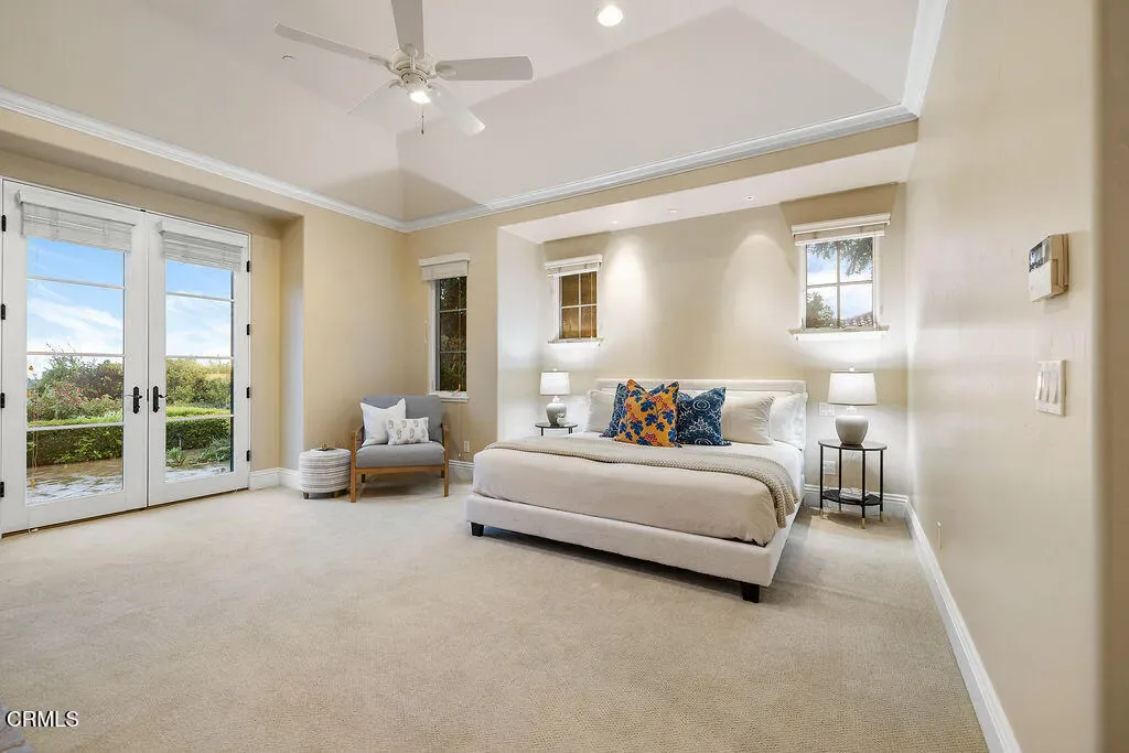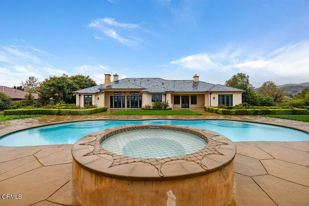 Designed by renowned architect Braden Sterling, this timeless French Provincial estate blends refined craftmanship with the serenity of wide-open Ojai Valley landscapes. Set on 2.1 private usable acres with unobstructed panoramic views of the iconic Topa Topa Mountains, this 4,244 sq ft residence offers five bedrooms, four bathrooms, and every amenity for luxurious indoor-outdoor living.French doors line the back of the home, opening to a resort-style backyard complete with a sparking swimming pool, adjoining spa and cozy fire pit—all framed by rose gardens, raised vegetable beds, and an orchard of mature fruit trees. The property also features two outbuildings, each with a retractable roof, ideal for creative pursuits or flexible workspaces. With room for horses and direct access to the Ojai River Preserve trails and Los Padres National Forest, this is true California living at its finest.Inside, the open, light-filled floorplan showcases high beamed ceilings, tile and hardwood flooring throughout much of the home, and a welcoming chef’s kitchen that flows into the great room perfect for entertaining. The indulgent primary suite is a private retreat, featuring dual walk-in closets, serene views, and a spa-like bathroom. Two wings of the home are dedicated to guest or family bedrooms, ensuring privacy and comfort. Three fireplaces add warmth and character, while fire sprinklers throughout provide peace of mind. Additional highlights include a private well, slate roof, and a large storage room off the garage.Quiet, private, and perfectly positioned to capture sunrise and sunset views, this estate is a rare opportunity to own a piece of Ojai serenity.