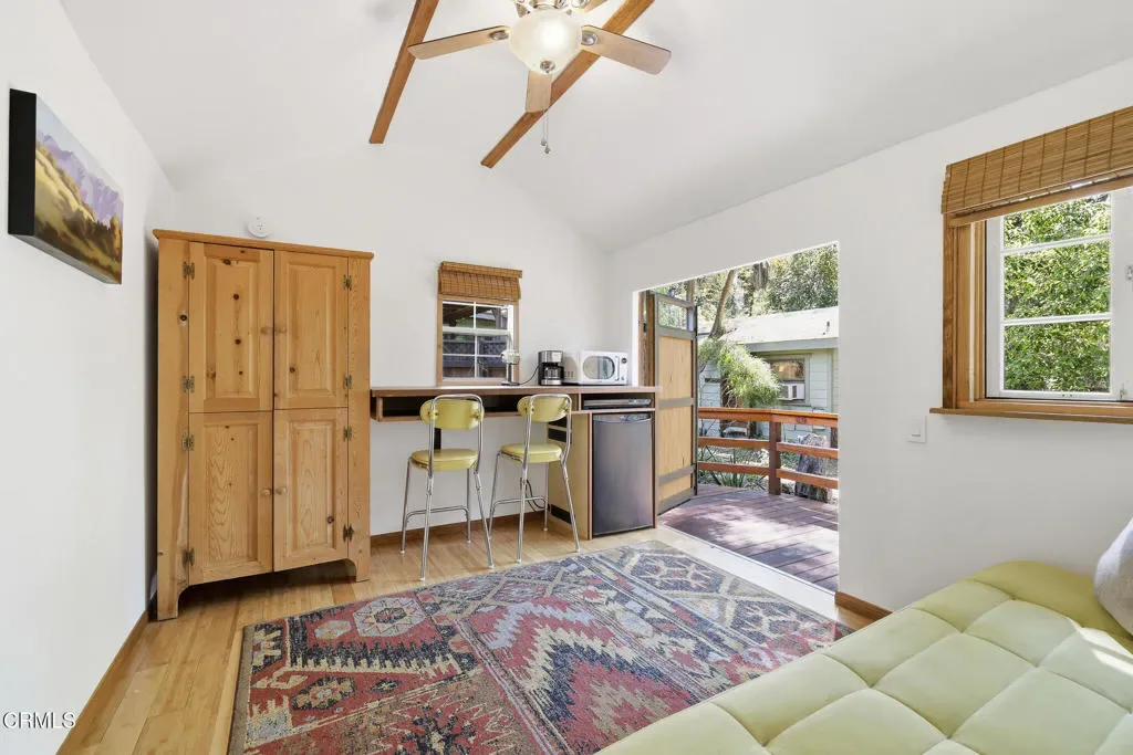 Tucked into Ojai’s most coveted East End enclave, a main, guest and tiny house offer a rare compound embodying a level of privacy, craftsmanship, and land value seldom found in one offering. Framed by hand-stacked stone walls and defined by soaring open-beam wood ceilings, the property speaks to those who recognize enduring quality and the quiet luxury of space. Warmth and timeless design radiate, while modern updates bring relaxed elegance and comfort. Mature gorgeous trees make a magical setting. Light filled interiors, open beam ceilings, warm natural materials, Doug Fir floors, beautiful landscaping and hand stacked rock walls embody the Ojai Living style. Ideal for multi-generational use, guest accommodations, or a live/work retreat, -enjoy the flexibility and timeless craftmanship. The home has newer Tesla power wall and converter installed, phase 2 electric vehicle charger, NOT in a high or very high fire zone, nor flood zone, newly installed split units throughout home and many gorgeous details showing the thoughtful layout and character.