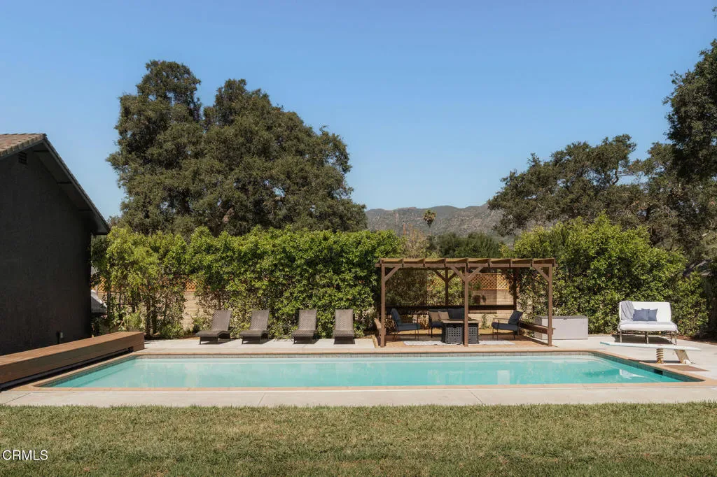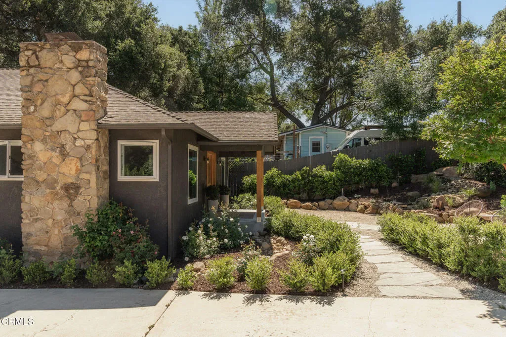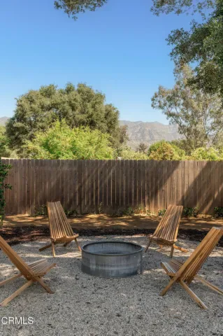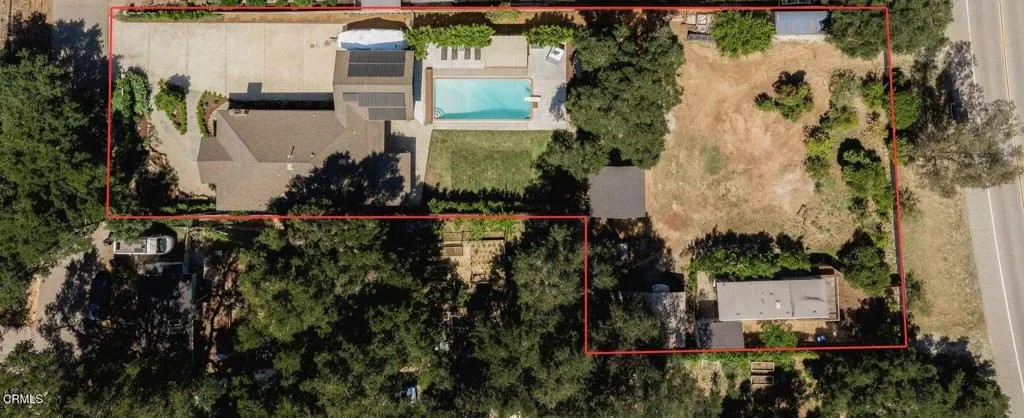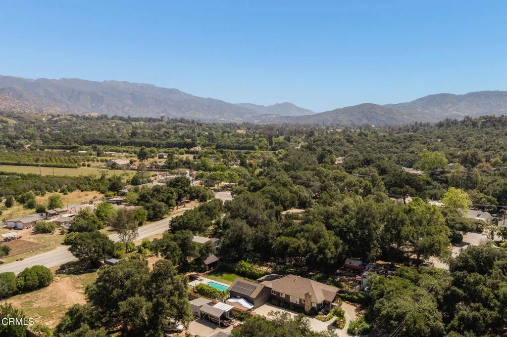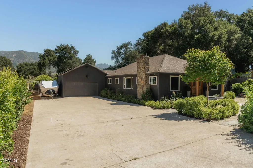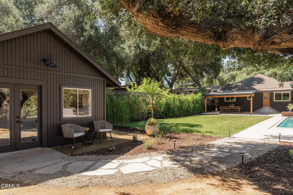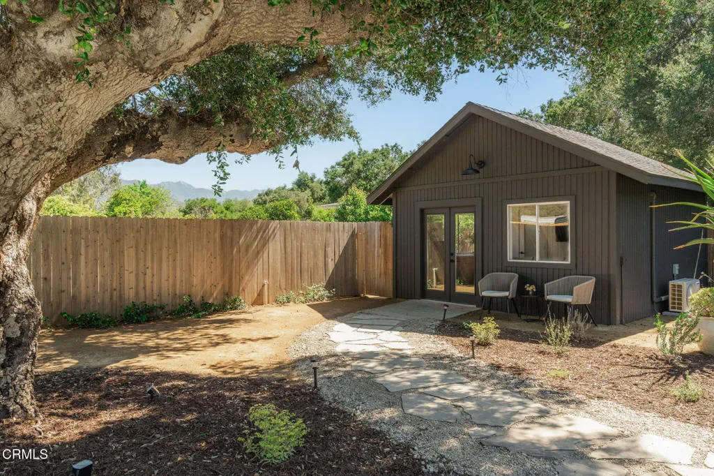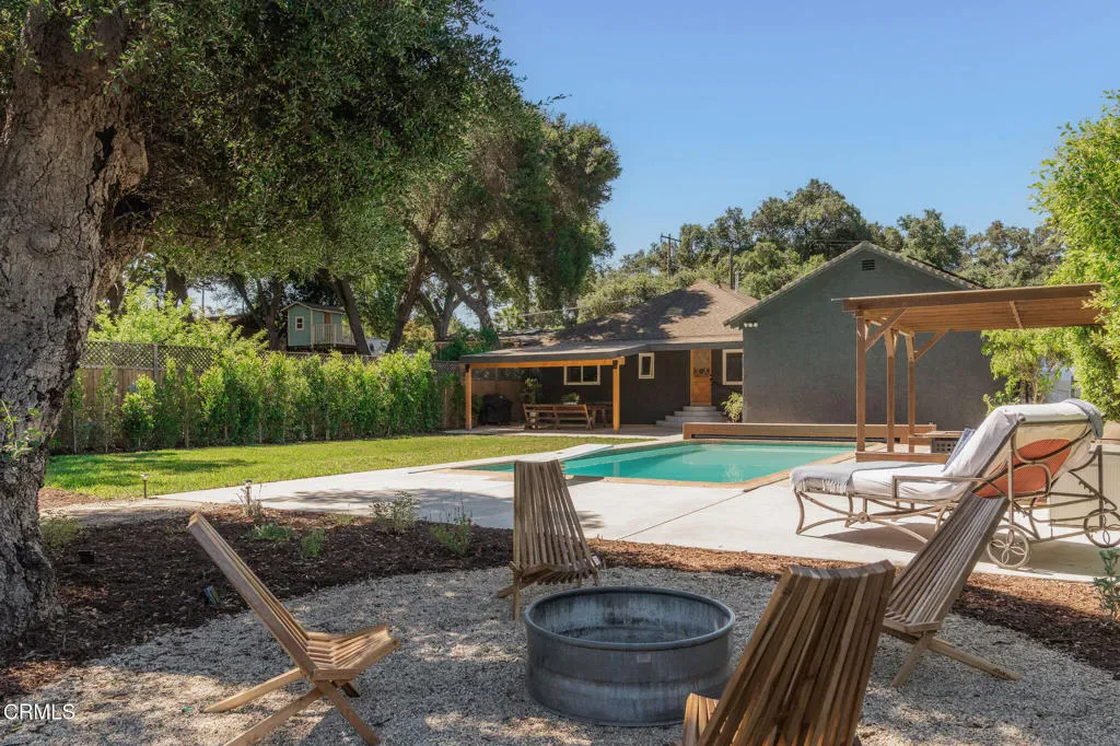 Tucked at the end of a quiet cul-de-sac in Meiners Oaks, this inviting property offers peaceful living with beautiful mountain views, including glimpses of Chief’s Peak. The main residence features 3 bedrooms and 2 bathrooms across approximately 1,600 sq ft, highlighted by recently refinished solid red oak floors, remodeled bathrooms, and a lightly updated kitchen. The inviting living space, centered around a charming fireplace, creates the perfect place to gather, unwind, and feel at home. Set on over half an acre, the property includes an expansive driveway and an oversized two car garage with newly added storage above. Step outside and the property truly begins to unfold. Beneath a newly built patio cover, long afternoons turn into memorable evenings, dining al fresco in the soft Ojai light. The backyard is anchored by a majestic oak tree, with a sparkling pool, cabana, and separate 256 sq ft pool house/office thoughtfully arranged around it. Whether hosting guests, creating a private workspace, or enjoying a quiet moment poolside, the setting offers exceptional flexibility and charm. Beyond the main yard, the property opens to a variety of mature fruit trees including avocado, citrus, persimmon, pomegranate, apricot, and nectarine. With ample space for animals, gardening, or expanded use, the property also includes a large metal-covered barn, a 20-foot shipping container for storage, and convenient rear access from the road behind. A rare opportunity to enjoy space, versatility, and the Ojai lifestyle in a peaceful setting, plus a special feature you’ll have to see in person.
