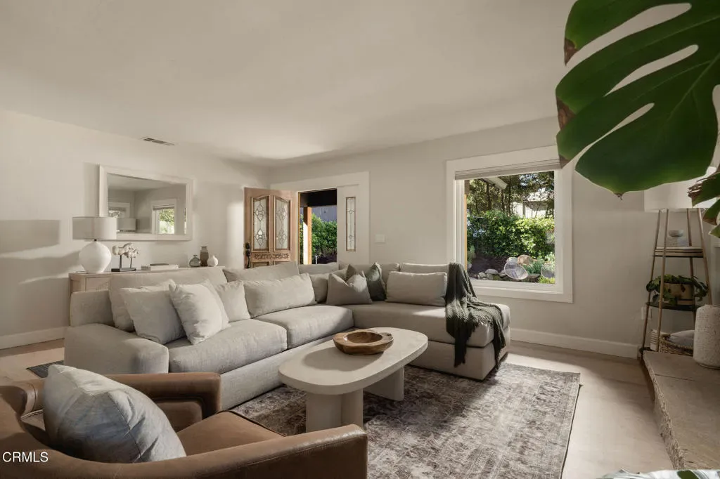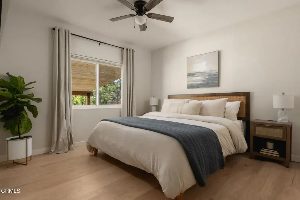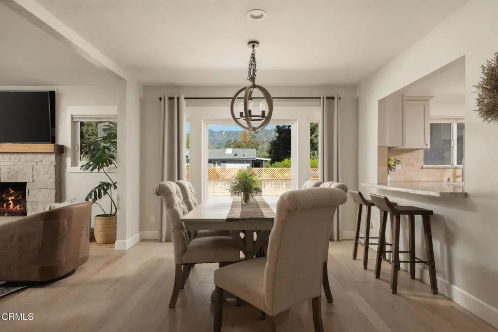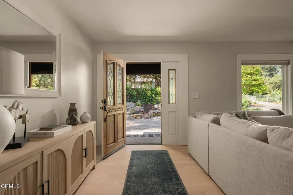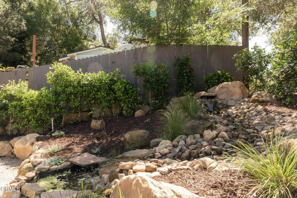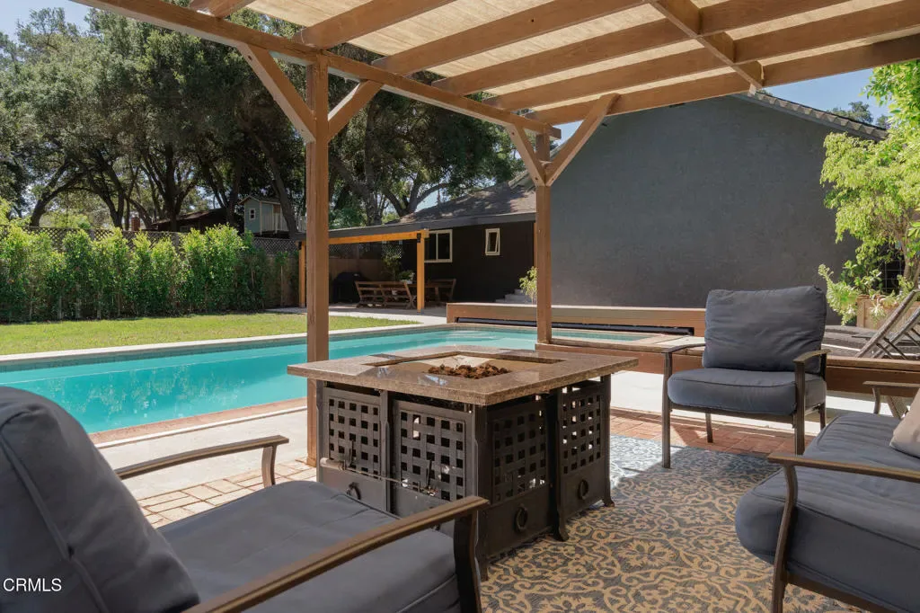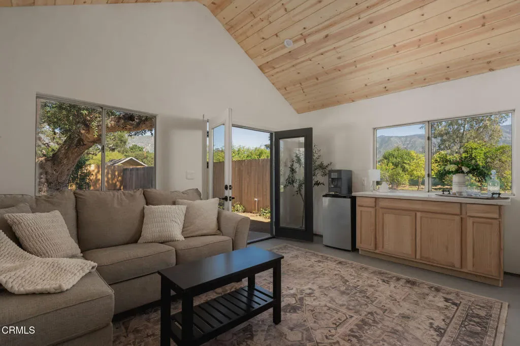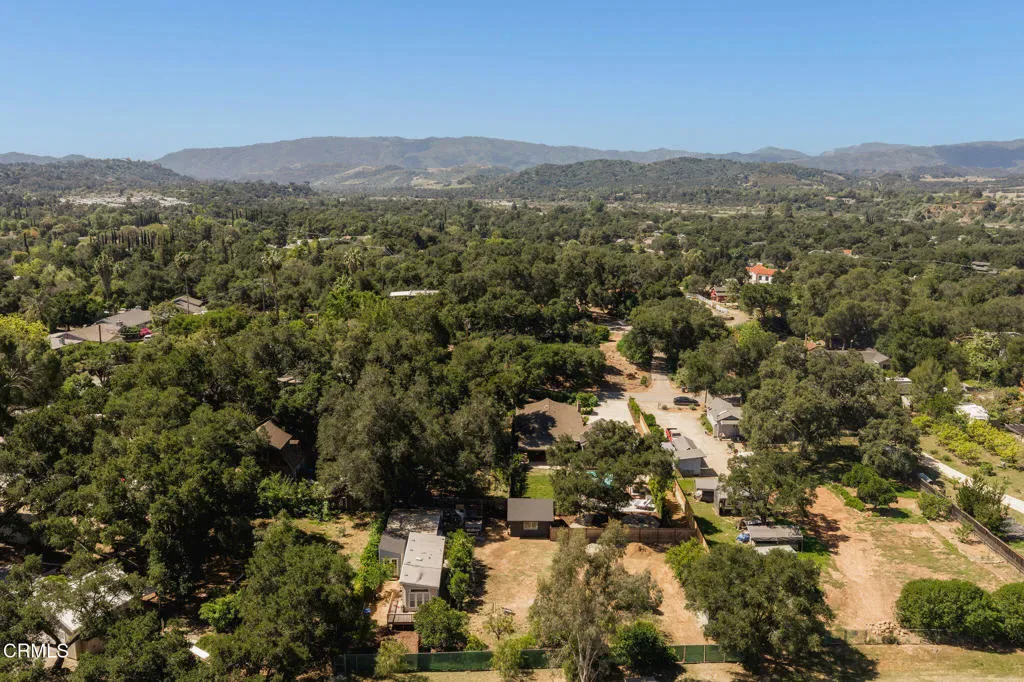 Tucked at the end of a quiet cul-de-sac in Meiners Oaks, this inviting property offers peaceful living with beautiful mountain views, including glimpses of Chief’s Peak. The main residence features 3 bedrooms and 2 bathrooms across approximately 1,600 sq ft, highlighted by recently refinished solid red oak floors, remodeled bathrooms, and a lightly updated kitchen. The inviting living space, centered around a charming fireplace, creates the perfect place to gather, unwind, and feel at home. Set on over half an acre, the property includes an expansive driveway and an oversized two car garage with newly added storage above. Step outside and the property truly begins to unfold. Beneath a newly built patio cover, long afternoons turn into memorable evenings, dining al fresco in the soft Ojai light. The backyard is anchored by a majestic oak tree, with a sparkling pool, cabana, and separate 256 sq ft pool house/office thoughtfully arranged around it. Whether hosting guests, creating a private workspace, or enjoying a quiet moment poolside, the setting offers exceptional flexibility and charm. Beyond the main yard, the property opens to a variety of mature fruit trees including avocado, citrus, persimmon, pomegranate, apricot, and nectarine. With ample space for animals, gardening, or expanded use, the property also includes a large metal-covered barn, a 20-foot shipping container for storage, and convenient rear access from the road behind. A rare opportunity to enjoy space, versatility, and the Ojai lifestyle in a peaceful setting, plus a special feature you’ll have to see in person.