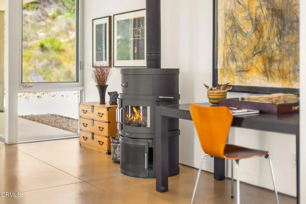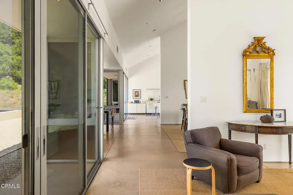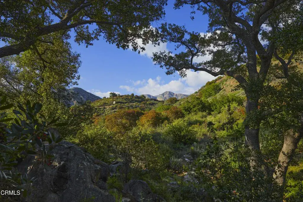 This remarkable forty-four-acre property is set just beneath the Topatopas in Upper Ojai’s rugged backcountry where the architect owners designed a modern, sustainable, residential compound. Over the last sixteen years they have rewilded the landscape and developed the walking trails that now vein its chaparral, oak meadowland, sage scrub and riparian habitats. Approached from the South, the compound is entirely hidden from the road. The house, guest house, pool & terraces are enfolded in the crook of a dramatic eastern ridge that provides unparalleled privacy, yet affords views of the Santa Ynez Mountains, the Upper Ojai Valley and Sulphur Mountain Ridge. The property is situated half-way between Ojai and Santa Paula.Surrounded by its gravel precinct, the light-filled, minimalist house sits amidst the trees and shrubs of the chaparral and includes three bedrooms and two baths. The cathedral ceilinged living, dining & kitchen flow into one another flanked by broad passageways and bookended by towering walls that demark the functions. To the North, the house opens to a 12′ X 48′ pool with views of the Topatopa foothills and beyond, to the mountain’s iconic spalled face.Mindful of the heat of summer, the house features shallow covered porches, or loggias, which open to the north and south & provide full summer shade and welcome winter sun. These loggias can be closed behind steel barn doors when there is the threat of wildfire. When not in use they park against the solid stucco walls of the house.The guesthouse/studio and a two-car garage sit below the last curve of the driveway which sweeps up to the house. Its linear design echoes the building above and provides two airy studios linked by an entry hall, a 3/4 bath and an efficiency kitchen.The property comprises two 20+ acre parcels separated by a low ridge dotted with native walnuts, oaks, toyon, and Matilija poppies. The western parcel is bordered by the year-round Bear Creek. Its meadows rise gently to a magnificent oak grove and offer opportunities for both architectural and agricultural development. The residential compound is carefully integrated within a landscape that nurtures the local fauna, birds, bees, hummingbirds and pollinating butterflies, while its buildings are holistically designed to provide serenity, utility & sustainability.Recently certified by Ojai Valley Land Conservancy’s ‘Rewild Ojai’ initiative, the estate was featured on their 2025 Native Garden tour.