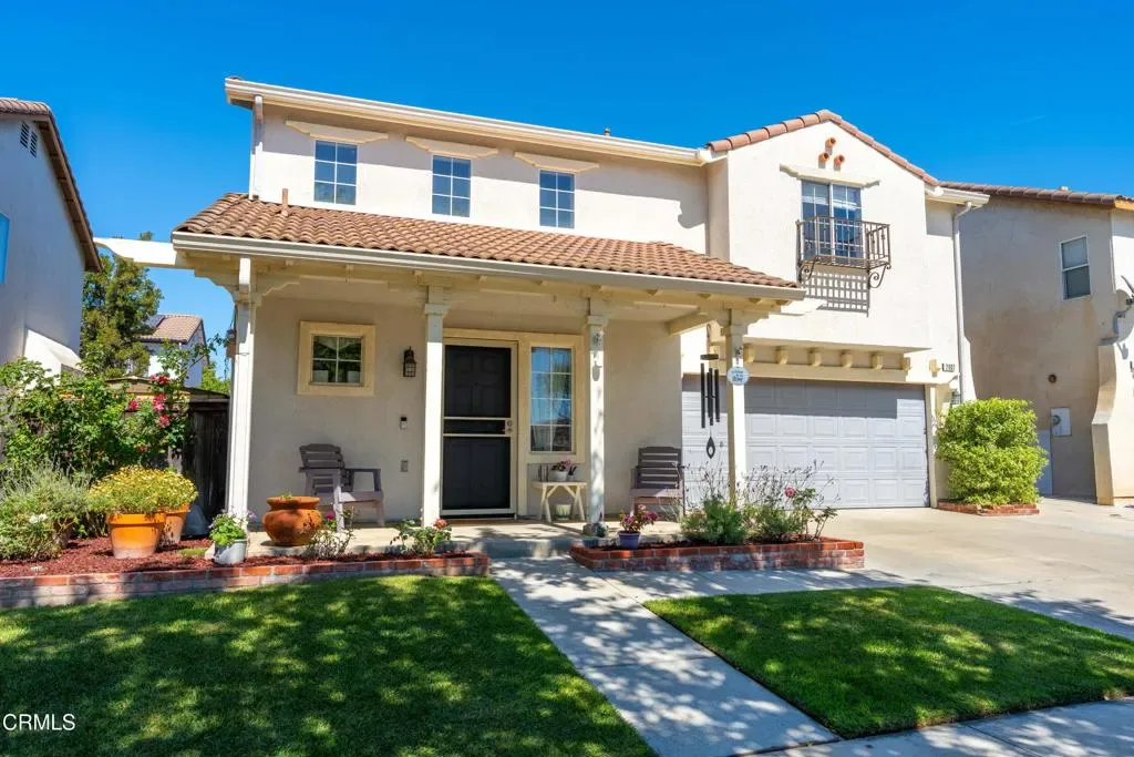 Welcome to this beautifully maintained two-story home showcasing timeless Spanish-inspired architecture with smooth stucco exterior, a classic clay tile roof, and charming wrought-iron balcony accents. Step inside to bright and inviting living room with soaring vaulted ceilings and abundant natural light streaming through upper clerestory windows, creating an open and airy feel. Neutral tones and wide-plank flooring provide a warm, modern backdrop that extends into family room dining and kitchen area. ***Comfortable and inviting family room designed for everyday living and relaxation. A cozy fireplace serves as the focal point, perfect for gathering on cooler evenings, while the open layout provides connection to dining and kitchen for easy entertainment. ** Kitchen features custom composite countertops, a spacious center island with seating, and a large farmhouse-style double basin sink positioned beneath a window overlooking the backyard. Crisp white cabinetry is complemented by stainless steel appliances, including a gas range, built-in microwave, dishwasher, and refrigerator. Recessed lighting and abundant natural light enhance the space, while the open-concept layout seamlessly connects the kitchen to private and low-maintenance backyard designed for both relaxation and entertaining.*** Featuring lush artificial turf for year-round greenery, this outdoor space offers ample room for lounging, play, or hosting gatherings. Raised planter beds with mature fruit trees add dimension and greenery along the perimeter. ** 3 bedrooms well sized bedrooms upstairs ** Primary suite offering comfort, functionality, and room to unwind. The oversized bedroom features abundant natural light, wide-plank flooring, and ample space for a sitting area or home office setup. A charming window seat with built-in cabinetry provides additional storage and a cozy place to relax. The en-suite bathroom is well-appointed with dual vanities, generous counter space, and abundant cabinetry for storage. A large walk-in shower with glass enclosure adds a clean, updated feel, while the thoughtful layout creates a private retreat separate from the rest of the home** This home offers the perfect blend of comfort, functionality, and low-maintenance living–ready for its next owner to move in and enjoy.