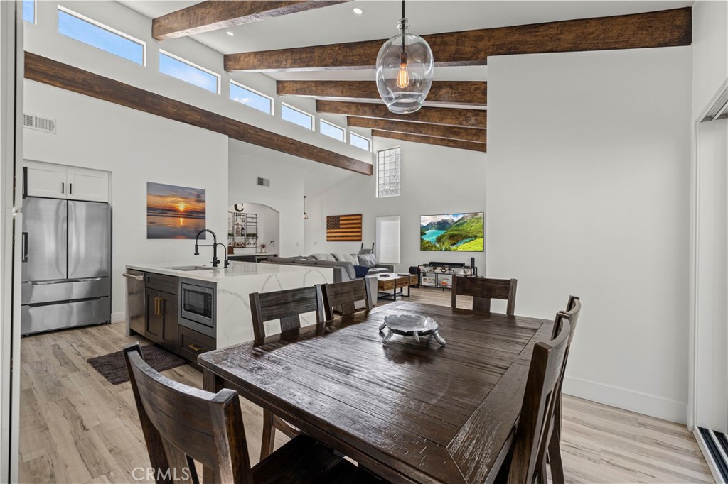 The interior is flooded with natural light courtesy of soaring beamed ceilings and strategically placed skylights. The open-concept living space features designer flooring and unique indoor-outdoor integration using modern bi-fold doors that open to an expansive waterfront deck and private dock. At the heart of this home sits a gourmet chef’s dream kitchen equipped with high-end appliances, a sleek waterfall countertop, and an oversized center island with breakfast bar seating—perfect for entertaining while taking in the unforgettable views.