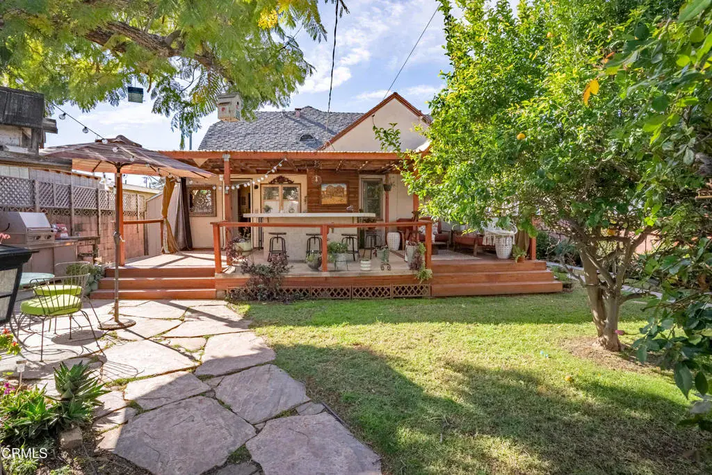 Charming Tudor & Spanish Revival style home in the heart of Oxnard! Just minutes to the beach! Enjoy walks to the theater, restaurants, Farmer’s Market, and many downtown events! Worry free parking with a new three car driveway!Front entry features a stunning, original 42′ Mahogany door. Enter this home into an impressive sunken living room with wood-burning fireplace and high coved ceilings. It has a spacious kitchen with custom tile-work, high end hardware, custom cabinets, and a movable island. Enjoy a sunset view from the adjacent dining room. The laundry room is also conveniently located next to the kitchen, with a large utility sink. The home has two bedrooms and one bath, with the latter offering a separate shower and tub, which has been beautifully remodeled with period details. The entire home boasts pride of ownership with well-cared wood floors, wood molding details, and vintage touches throughout. The entertainer’s backyard features a large deck with a bar and seating area. There is also a functional, covered Jacuzzi in a yard with mature trees, including a lemon tree and a mature Cecile Brunner climbing rose bush, many decades old. The property is Zoned R2.
