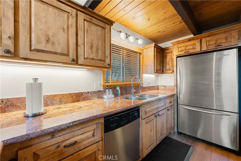 The kitchen includes wood cabinetry, granite countertops, stainless steel appliances, and a dining area.