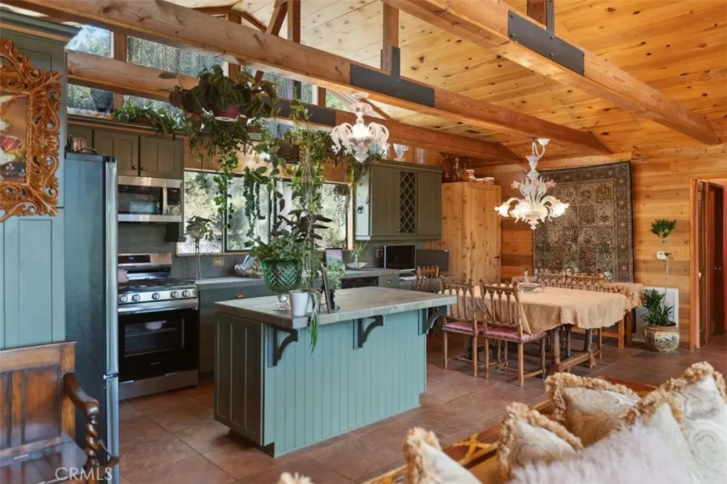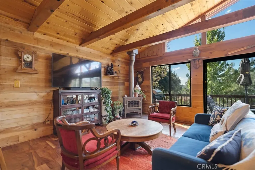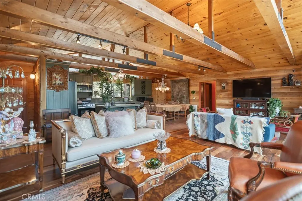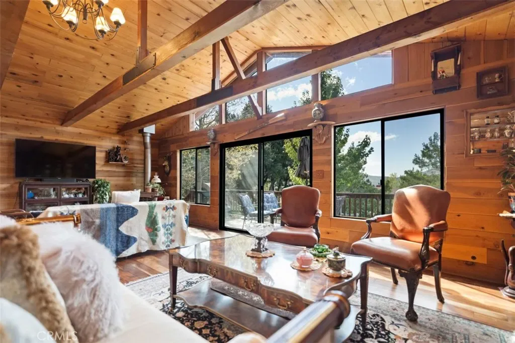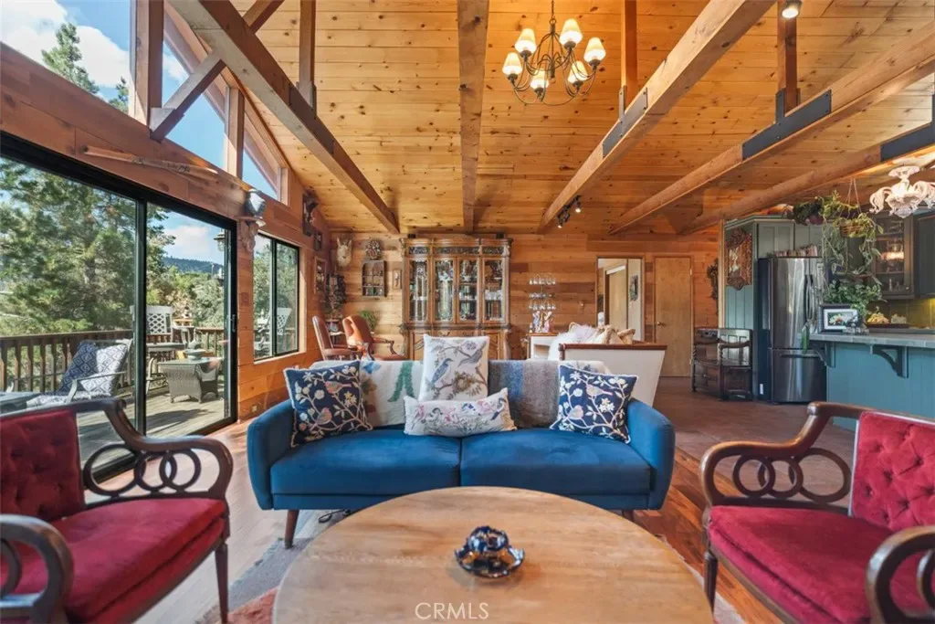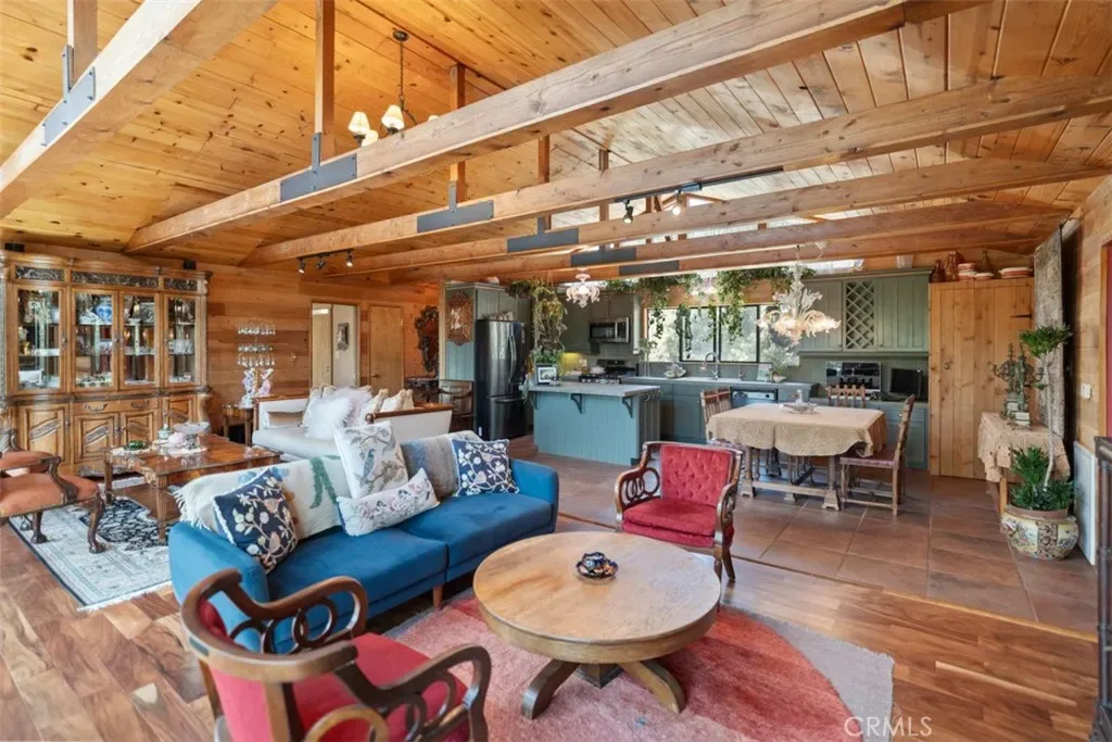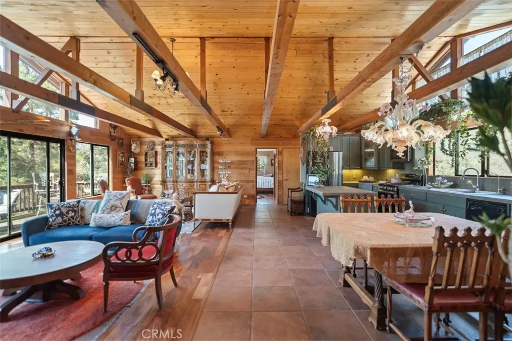 Enter through the welcoming foyer into a spacious great room that captures the heart. Soaring wood-beamed ceilings and large windows frame stunning mountain views and vibrant sunsets, while a freshly cleaned wood-burning stove adds cozy warmth. New hardwood flooring (2024) flows throughout, tying the open-concept layout together with timeless elegance. The kitchen, open to the great room, features a large island for casual meals or lively gatherings, ample storage, and modern appliances. The adjacent dining area spills onto a spacious deck, expanding your living space into the crisp mountain air—perfect for morning coffee or evening stargazing.