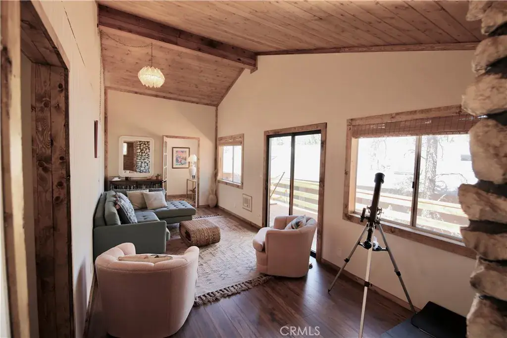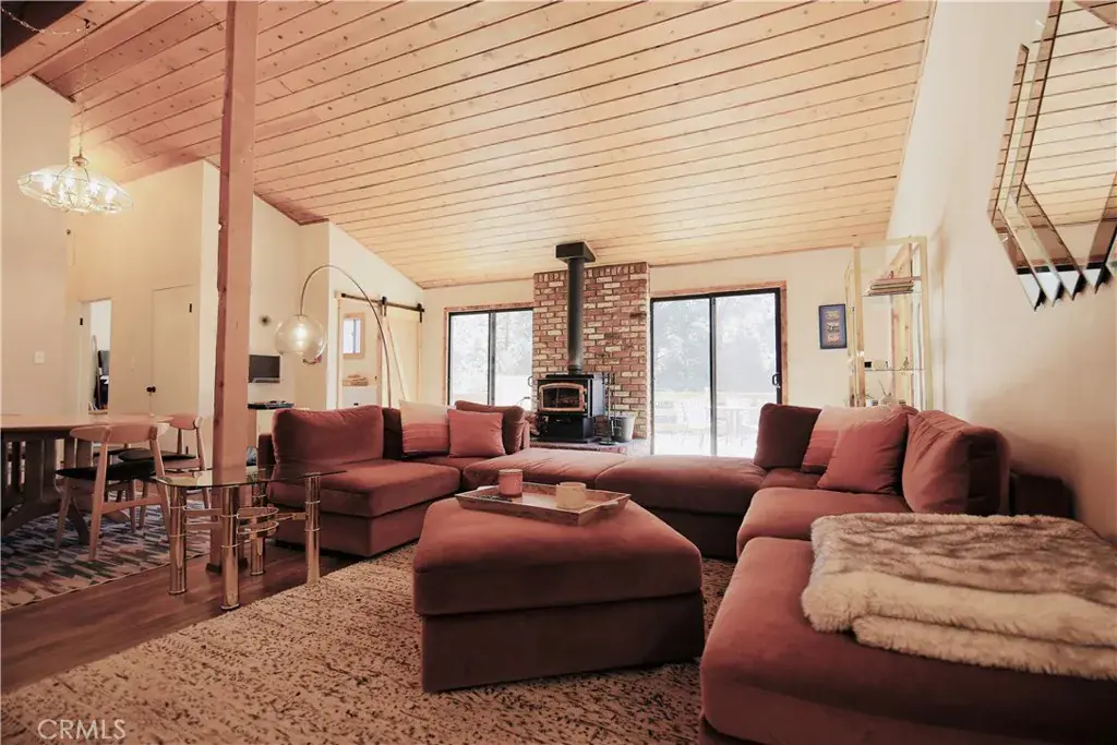 Step inside to an impressive living room with a wood-beam cathedral ceiling, warm laminate wood floors, and a wood-burning stove set on an elevated brick hearth. The open floor plan connects the living, dining, and kitchen areas seamlessly, while a separate family room creates the perfect retreat for kids or cozy evenings.