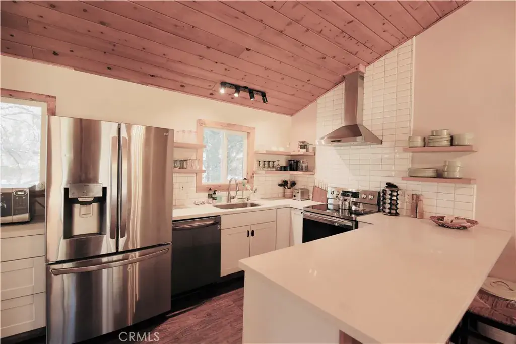 The kitchen blends modern style with timeless charm—featuring stainless steel appliances, a sleek range hood, white Corian countertops, crisp white cabinets, and floating shelves that offer stylish display space.