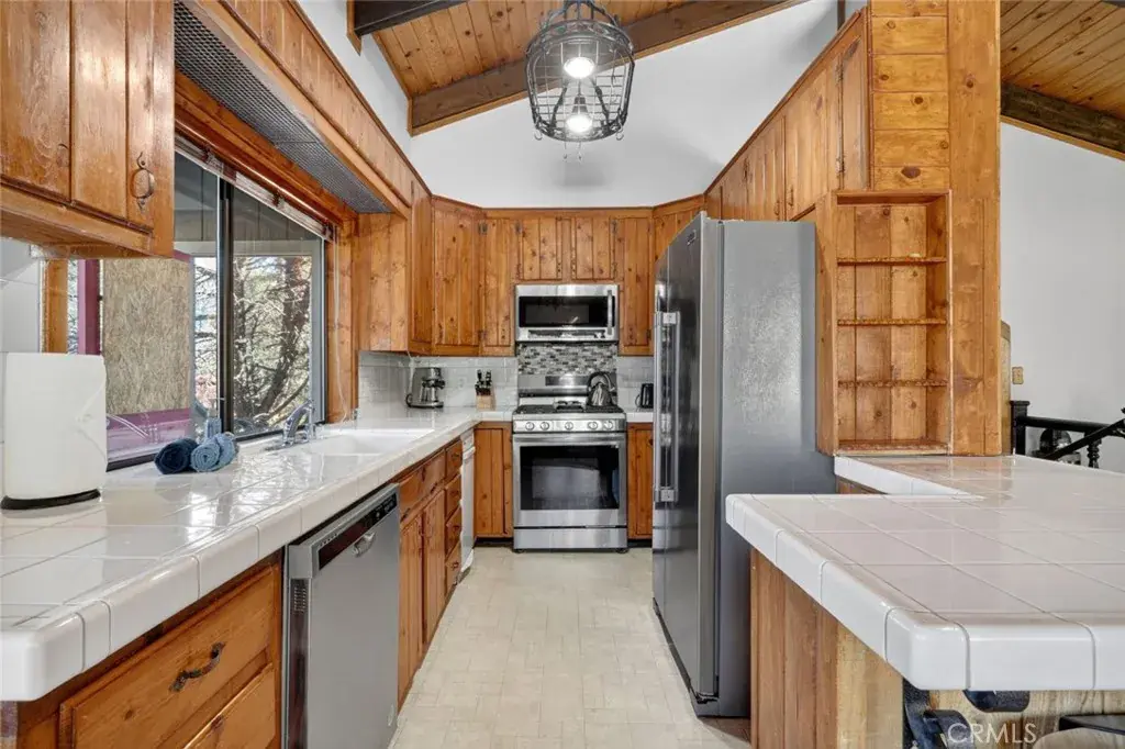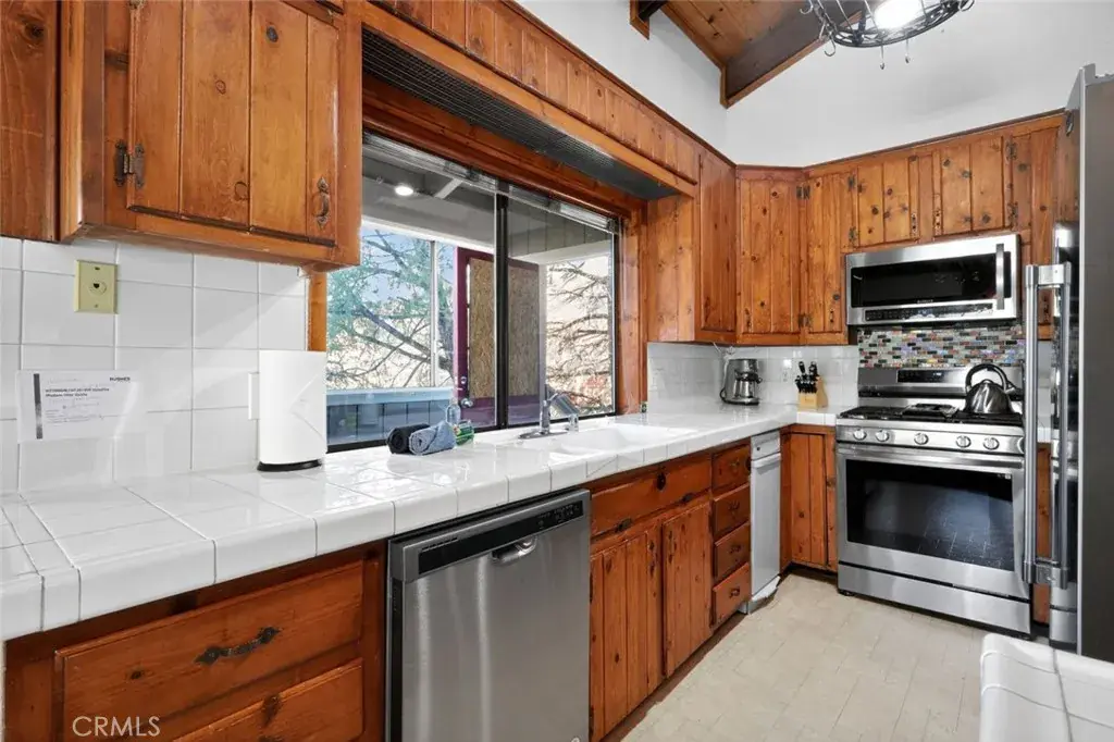 The kitchen boasts classic white tile countertops, stainless steel appliances, and an adjoining dining area framed by large windows showcasing breathtaking scenery. The primary suite offers a private oasis with a soaking tub and separate shower for ultimate relaxation.