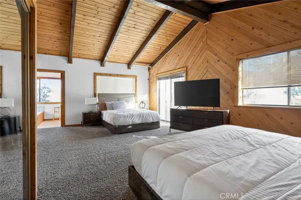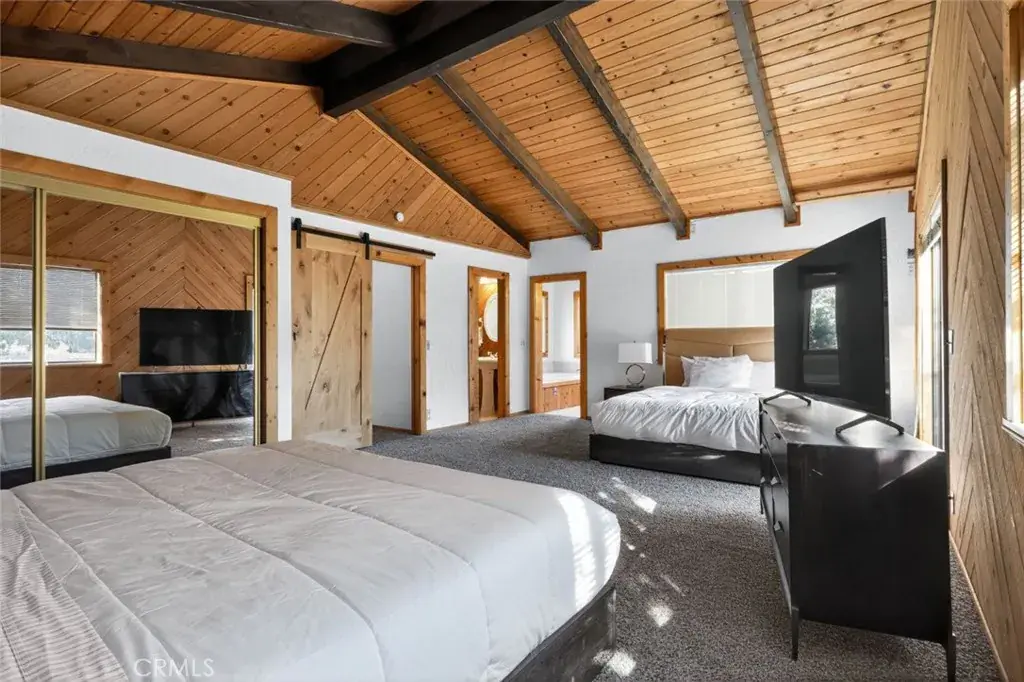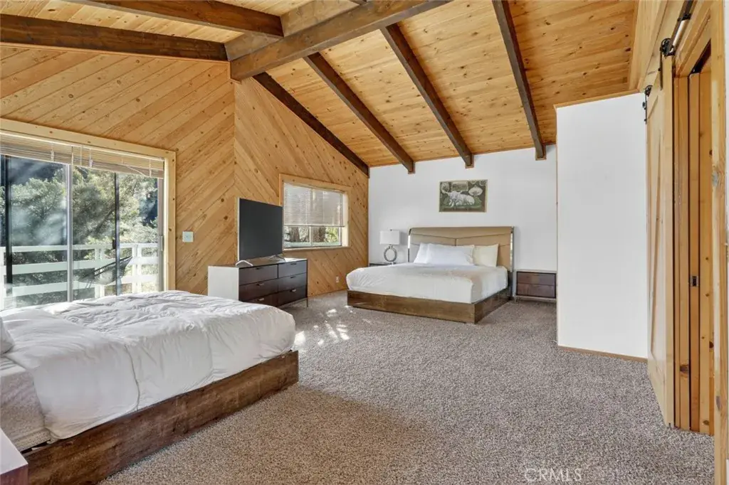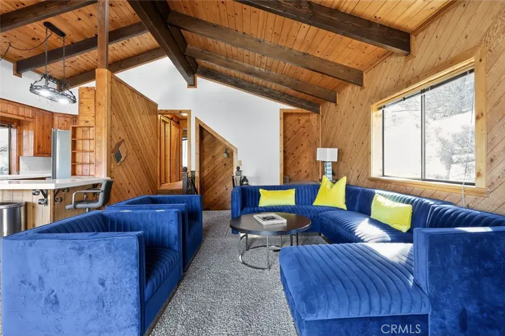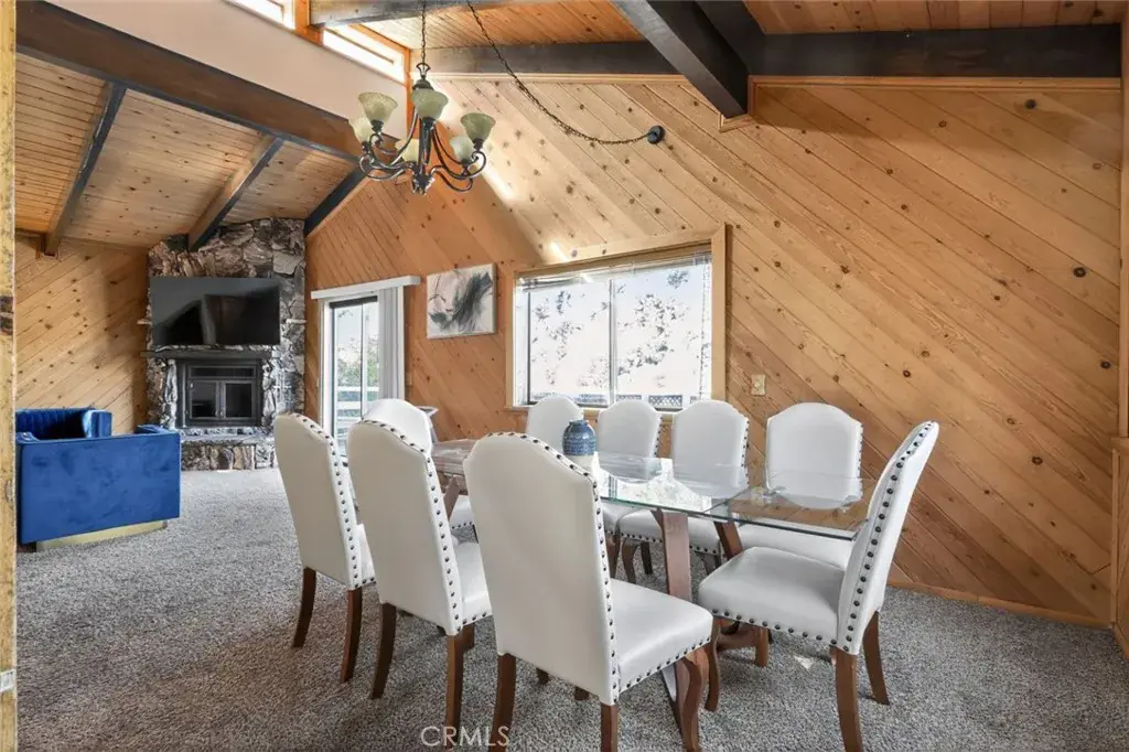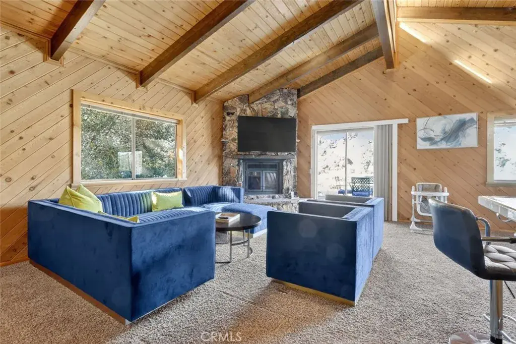 Once inside you’ll discover charming wood-toned walls, beamed ceilings with fans, and skylights that fill the living room with natural light. The cozy rock fireplace creates the perfect mountain retreat ambiance, while the deck offers a peaceful seating area to take in the stunning forest and mountain views.