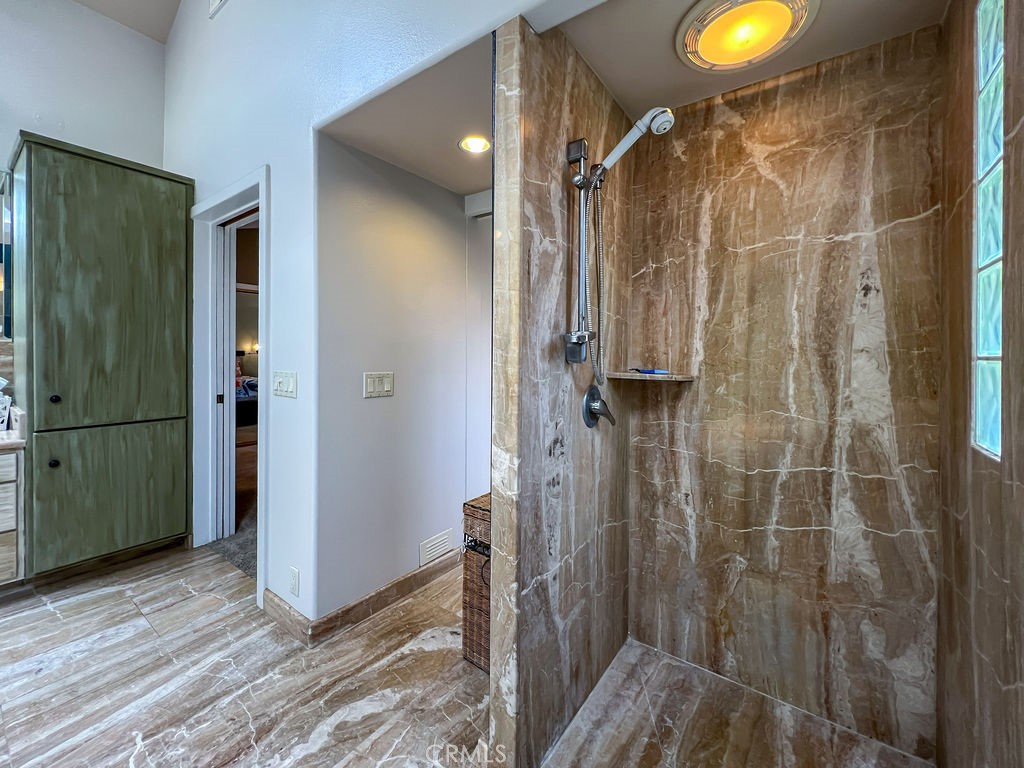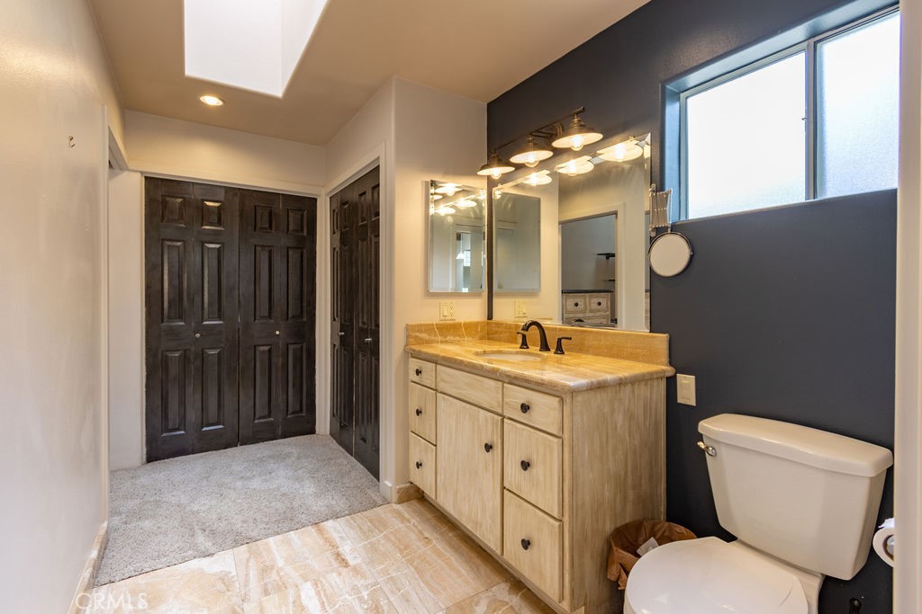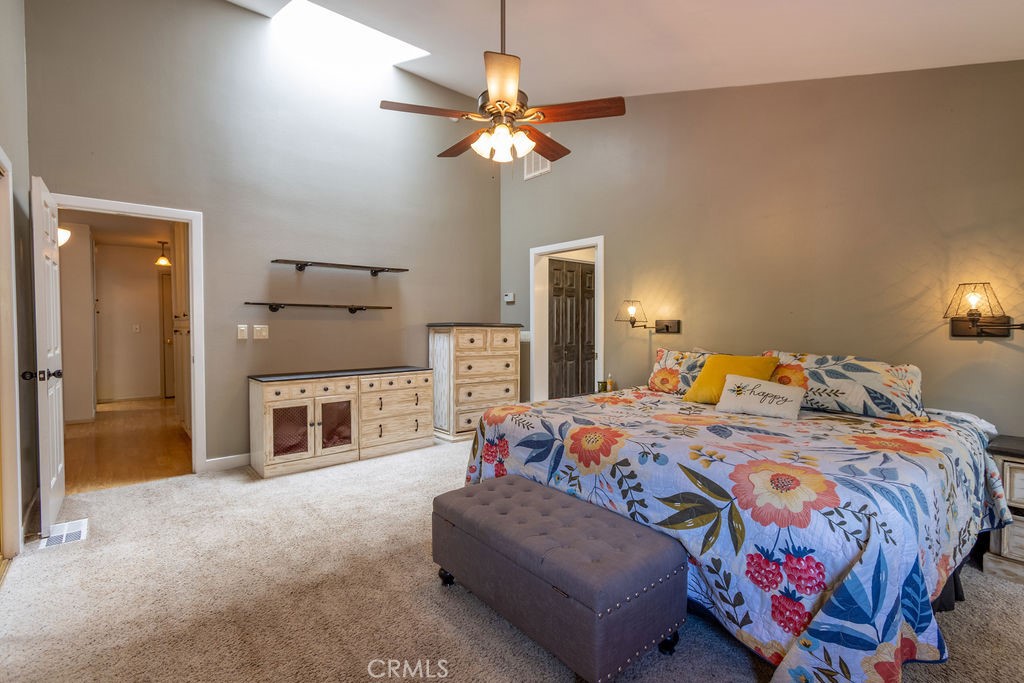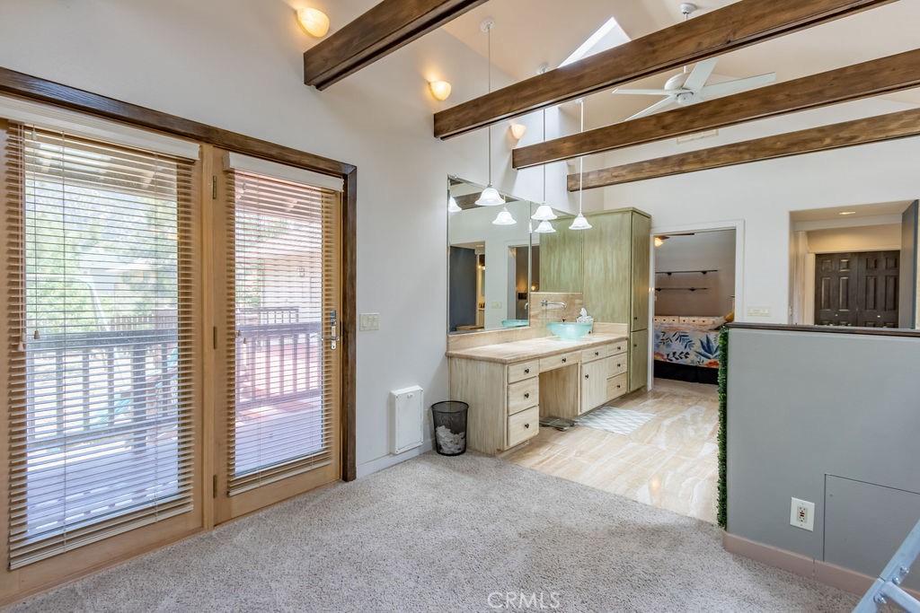 This home offers three spacious bedrooms, including a luxurious primary suite that features three closets, vaulted ceilings, and skylights, bathing the room in natural light. The primary bathroom is a true retreat, complete with a jet tub, separate walk-in shower, an expansive vanity, large wooden ceiling beams, and an extra room that can serve as an office or gym, also with French doors to the back deck. The home includes two full bathrooms, ensuring ample convenience for family and guests.