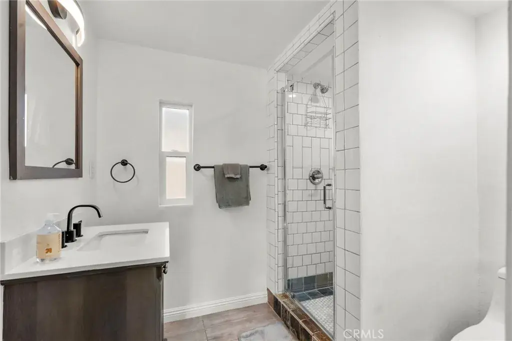 The bathroom includes a sleek walk-in shower accented with stylish tile work and a chic honeycomb-patterned floor, adding a touch of sophistication. The bright, comfortable bedroom offers ample closet space to accommodate your storage needs.