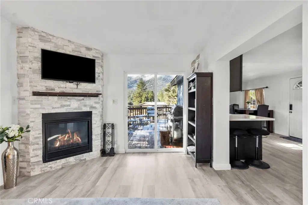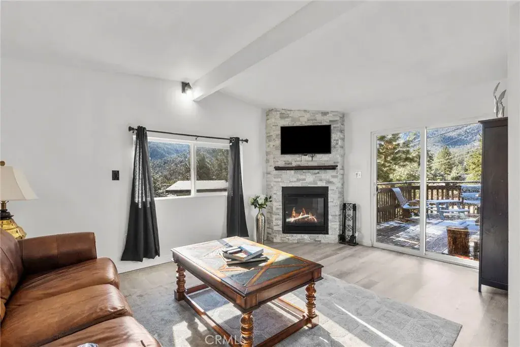The sunlit living area offers a warm and inviting atmosphere, complete with a rustic fireplace that sets the perfect mood for relaxing or hosting guests. The thoughtfully designed kitchen provides abundant cabinet space along with modern stainless steel appliances, making cooking both easy and enjoyable.