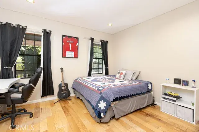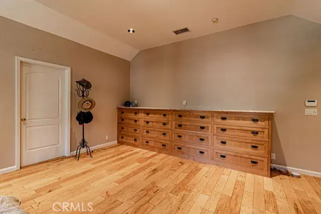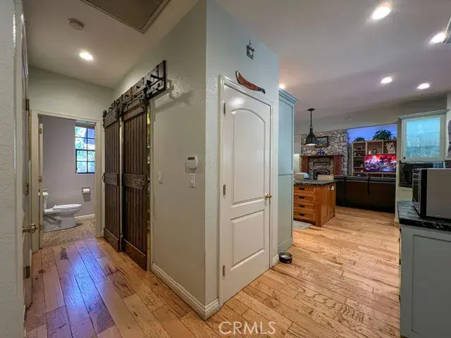 Versatile Game Room/Office: A massive 675 sq. ft. game room with a wood-burning stove, 68×3′ wall shelves, and a 42′ storage closet—ideal for work, play, or hobbies. Hickory wood flooring flows throughout, complemented by recessed lighting for a warm, inviting glow.