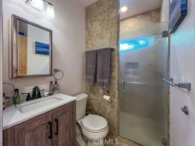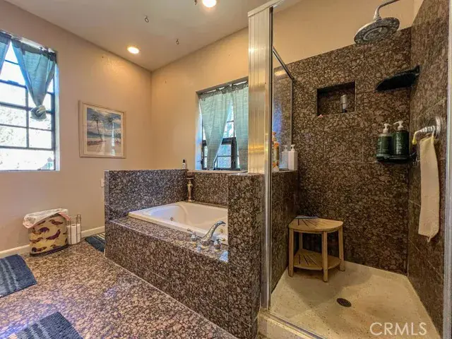 The common bathroom features a custom tile walk-in shower with dual shower heads.