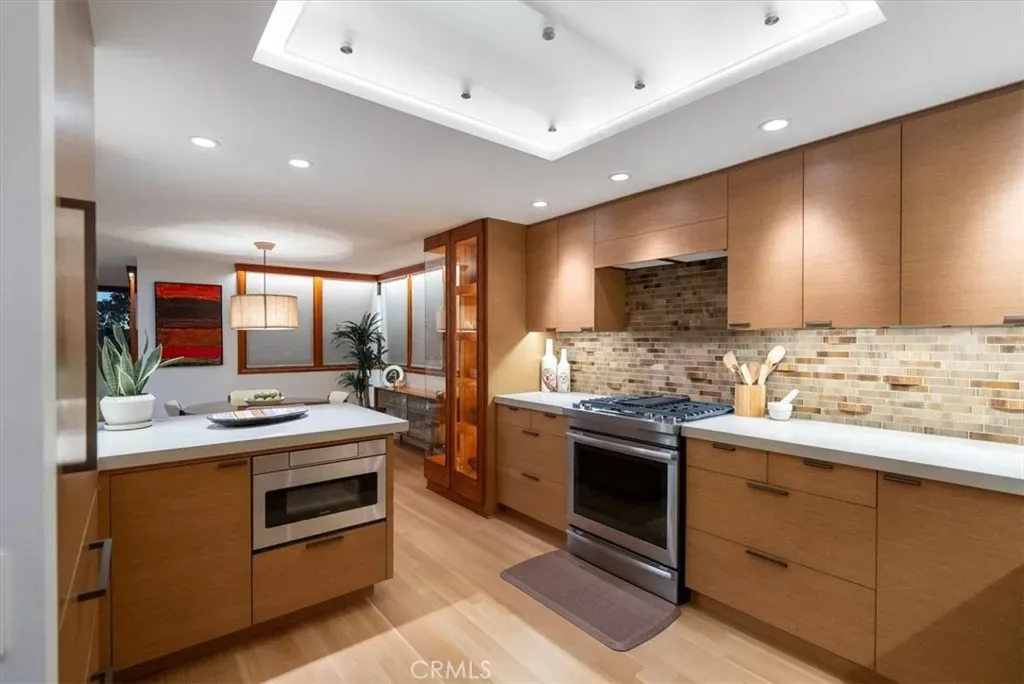 The kitchen is equally considered, featuring white oak cabinetry, Bosch, JennAir, and Sub-Zero appliances, Wa-kei Waiko Japanese tile, Kiesebohmer storage systems, and a skylight topped with a custom 3form panel that provides soft ambient light.