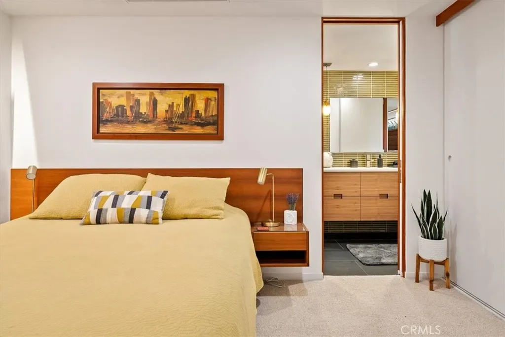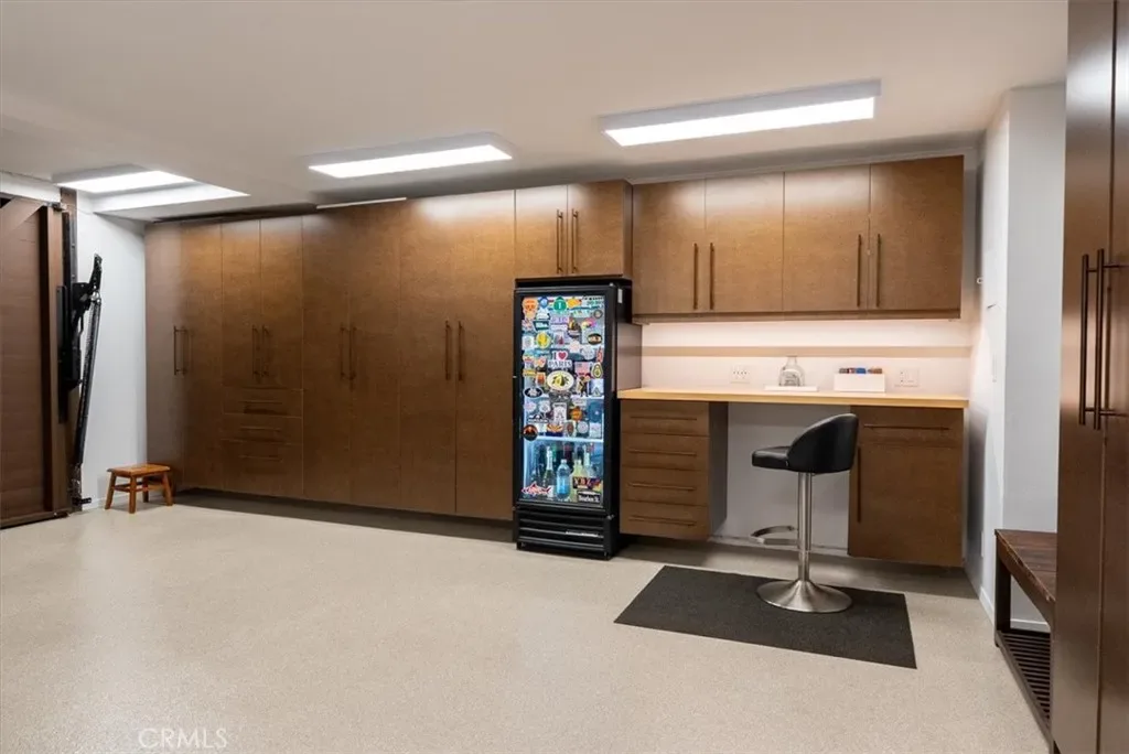Upstairs, the primary suite is a private retreat with its own ocean-view balcony and panoramic vistas stretching south from Point Sal to Avila Bay. Caseta by Lutron lighting, a floating dual vanity, poured concrete countertop, and Hansgrohe fixtures define the spa-inspired ensuite. The second bedroom includes an ensuite bath, while a third bedroom—currently styled as an office—offers flexibility with custom cabinetry and generous storage.