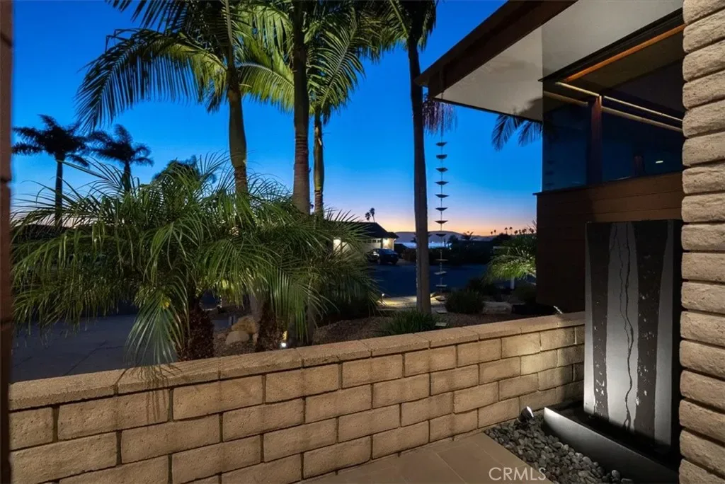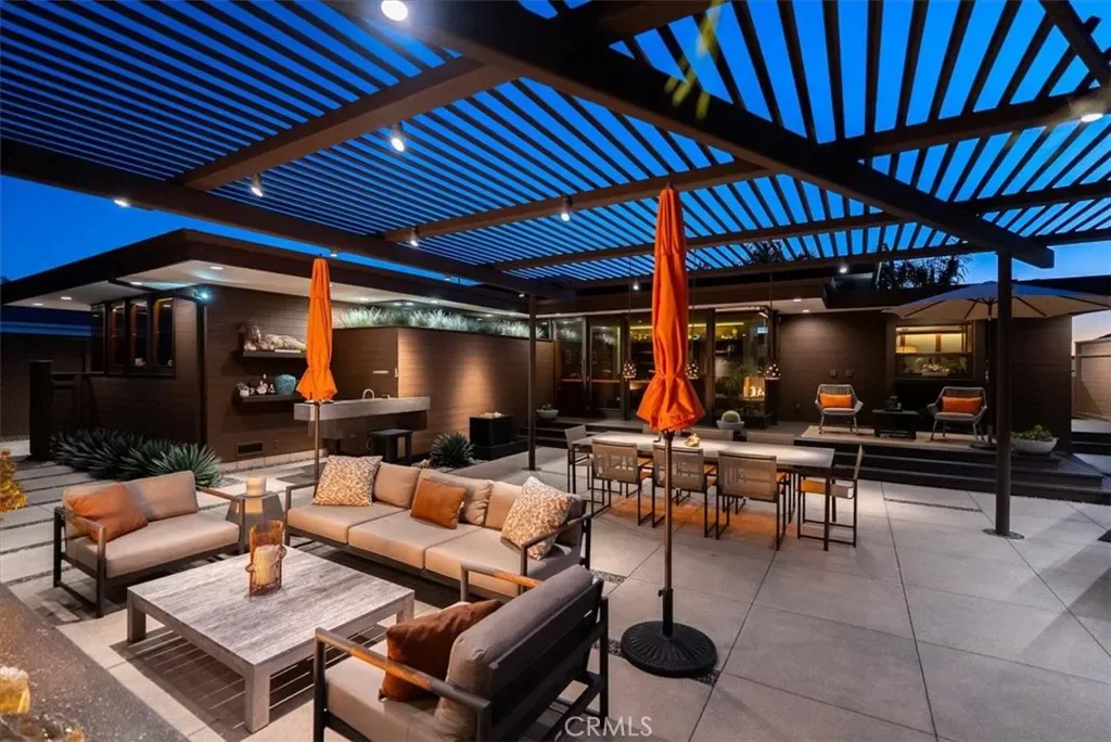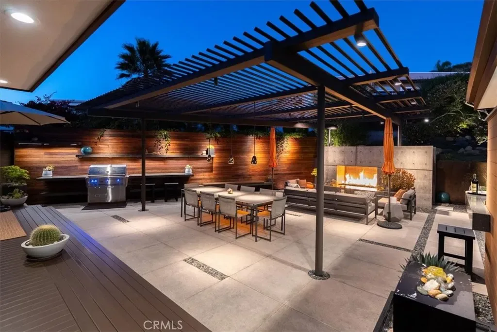 Outdoor living is thoughtfully layered across levels. The lower deck functions as an extension of the home, ideal for gathering, dining, and enjoying the ocean breeze. The backyard entertaining area features specialty concrete floating terraces, a fireplace with custom concrete hearth, integrated seating, a Lynx BBQ, a cantilevered bar, and rare 1960s Peill & Putzler pendant lighting beneath a trellis. Mature landscaping, including King palms and producing Hass avocado trees, enhances privacy and tranquility. A side yard includes a detached storage shed with potential for a future spa and outdoor shower.