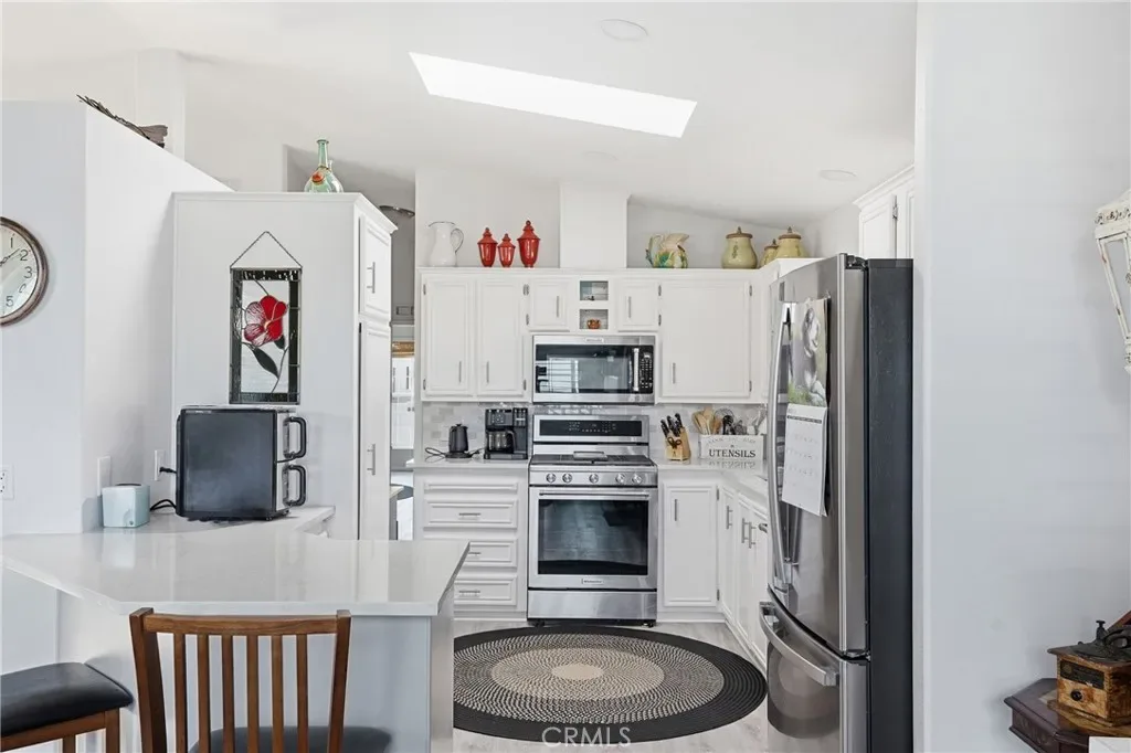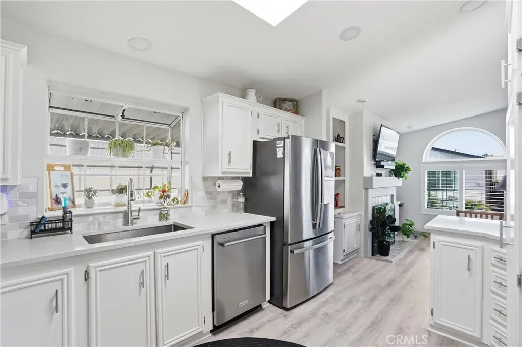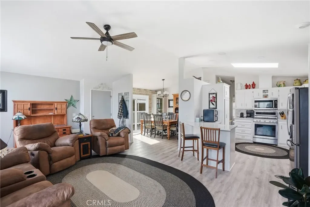 Step inside to an inviting open-concept layout featuring laminate flooring throughout and an abundance of natural light. The spacious living room welcomes you with vaulted ceilings, a cozy fireplace, built-in cabinetry, and a ceiling fan—creating a warm yet airy space to unwind or entertain. The kitchen is thoughtfully designed with a breakfast bar, stainless steel appliances, ample storage, a bay window, and a skylight that fills the space with sunshine. Just off the kitchen, the dining area offers additional built-in cabinetry and a sliding glass door that opens seamlessly to the deck, perfect for indoor-outdoor living.