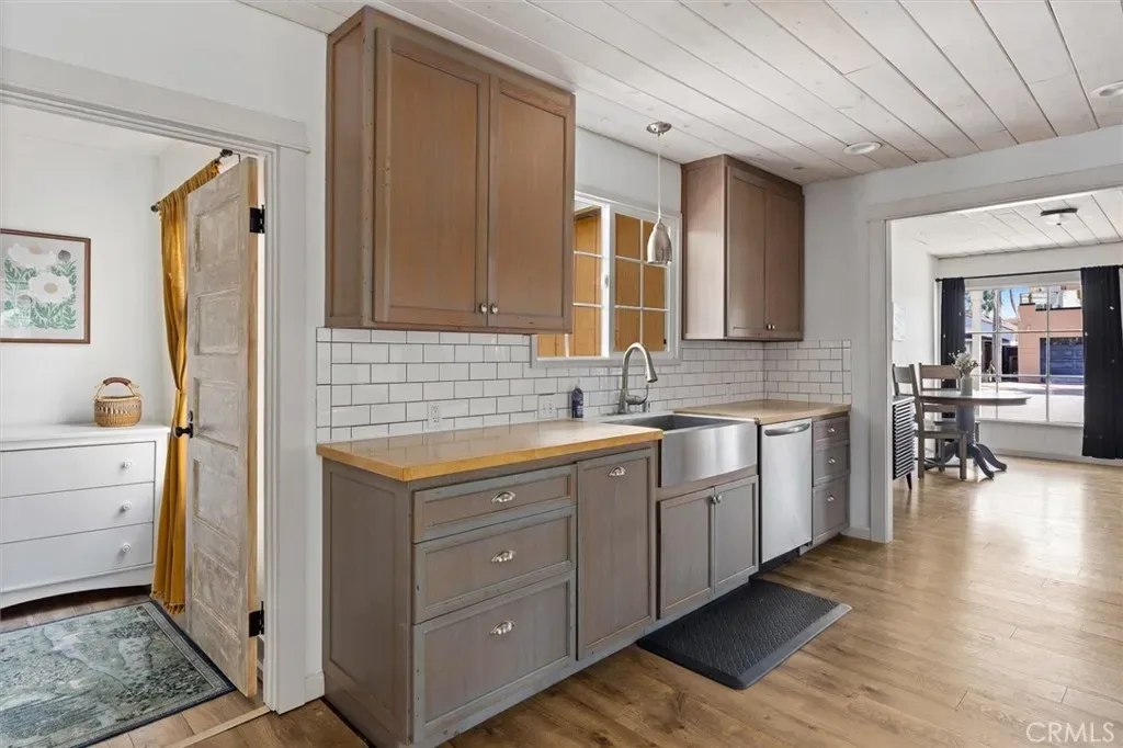 Experience the charm of coastal living at 244 Windward Avenue in desirable Shell Beach, CA. This adorable single-level beach bungalow offers 3 bedrooms and 2 bathrooms (currently configured as a 2-bedroom with a den) across 909± square feet, blending character, comfort, and an effortless beachside lifestyle. Inside, laminate plank flooring and shiplap ceilings create a warm, cohesive aesthetic. The inviting entry features a swinging screen door, perfect for enjoying the refreshing ocean air, and a large picture window that fills the home with natural light. The front bedroom, currently used as a den, offers flexible living space with a custom barn door, closet, and direct access to the Jack-and-Jill bath. The stylish kitchen showcases butcher block countertops, subway tile backsplash, a farmhouse stainless-steel sink, recessed lighting, and a suite of stainless-steel appliances, including a built-in Vinotemp wine refrigerator. Two rear bedrooms provide peaceful retreats. One features beautiful natural light and ample closet storage, while the other offers French doors leading to the backyard along with built-in shelving and convenient access to the Jack-and-Jill bath. A second bathroom includes a glass-enclosed shower and a large operable window for natural light and ventilation. A dedicated laundry nook with a stackable LG washer and dryer adds everyday convenience. Step outside to your backyard oasis. The enclosed yard features a raised wood deck with string lights, lawn area, raised garden beds, passion fruit vines, Meyer lemon tree, bird of paradise, and mature palms, creating an ideal setting for entertaining or relaxing under the coastal sky. Additional highlights include a new mini-split HVAC system and an attached shed with 220V wiring ready for EV charging. Located just moments from the ocean in the sought-after Shell Beach community, this home offers the perfect opportunity to embrace Central Coast living in one of the area’s most beloved seaside neighborhoods.