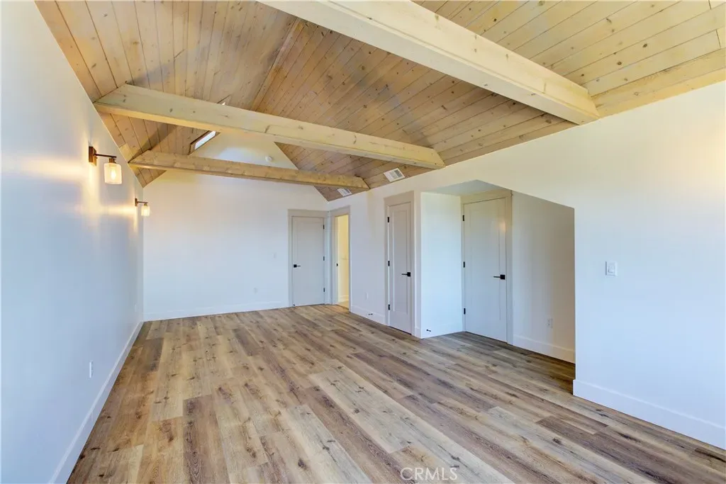 The spacious master bedroom showcases authentic vaulted tongue and groove ceilings, along with a walk-in closet that offers custom shelving throughout for optimal organization. Revel in the incredible ocean views that provide a serene backdrop for relaxation.