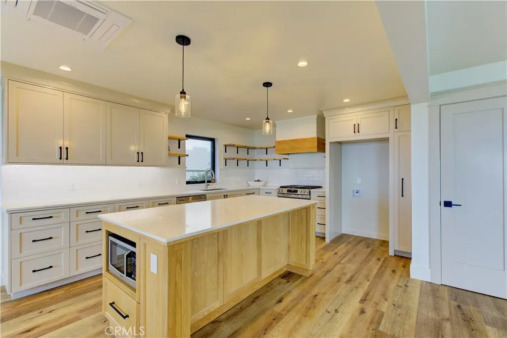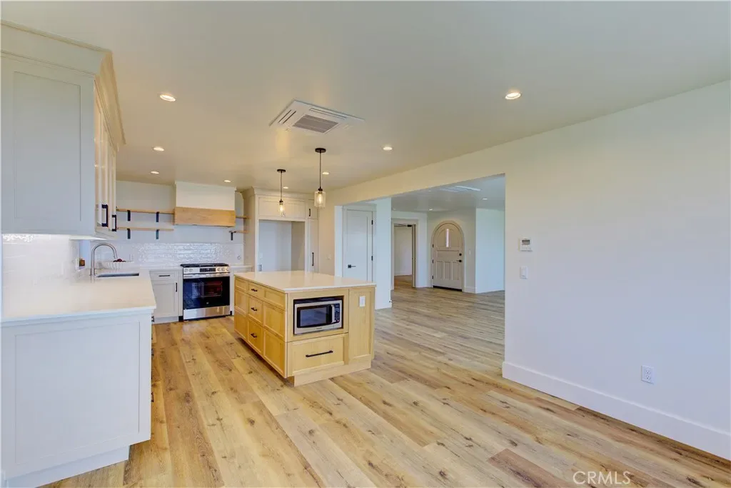 In addition to this elegant, crafted home, has a wraparound porch that extends from the front door all around the front of the house. It features custom railings with glass retaining panels. For those evenings or early mornings when you want to enjoy an oasis-like atmosphere, the backyard presents a refined outdoor fireplace with plenty of seating and panoramic views of the Central Coast and foothills.