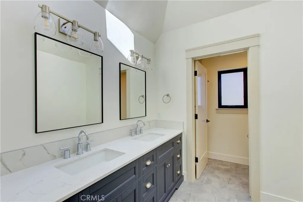 An additional upstairs bathroom features a double vanity, a stylish tile shower, and a separate toilet room, all finished with majestic white Cortez Calacatta marble accents. European-style shaker cabinets with soft-close doors and drawers, paired with a stunning white oak island, elevate the kitchen’s elegance.