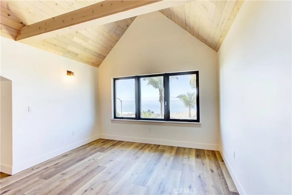 The spacious master bedroom showcases authentic vaulted tongue and groove ceilings, along with a walk-in closet that offers custom shelving throughout for optimal organization. Revel in the incredible ocean views that provide a serene backdrop for relaxation.