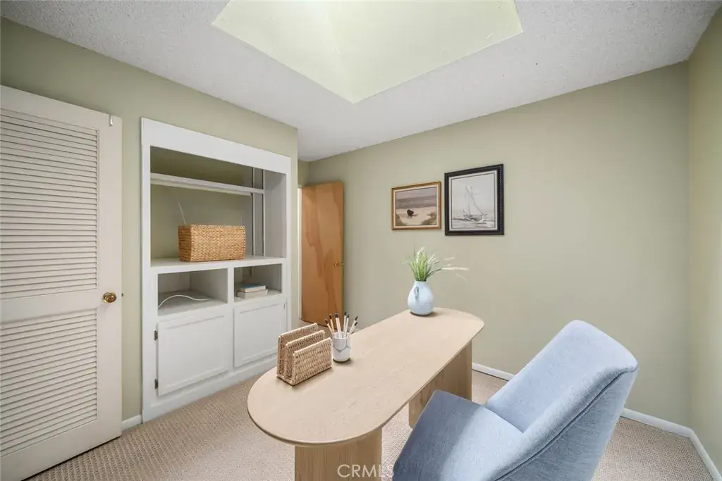 The downstairs primary suite features a ceiling fan, sliding door access to a private flagstone paver patio, and an ensuite bath with walk-in shower. Also on the main level are two additional bedrooms (one currently used as a dedicated office with built-in storage and skylight), and a full bath. A downstairs laundry room with storage doubles as a convenient mudroom with garage access.