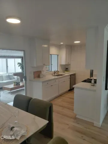 Welcome to Hueneme Bay! A charming 55 + community just minutes from the beach, Channel Islands Harbor, parks, and shopping centers. 160 W Fiesta Grn – Single-Level End-Unit-This beautifully updated 2-bedroom, 1-bath home offers a dedicated plus size laundry/hobby room with it’s own entry, attached to the 2-car garage. Modern upgrades in the remodeled kitchen include quartz countertops, stainless steel appliances, new gas stove and cabinets for ample storage. New LVP flooring for easy upkeep. This home includes a large room off the dining area that can be used for many purposes it’s fantastic extra square footage. Private back patio, covered front porch. Many lush trees and plants surround the meticulously maintained grounds. Amenities include resort-style heated year round pool, spa, 9 hole golf course, clubhouse, billiard room, sauna. Pleanty of guest parking. Picturesque pedestrian-friendly neighborhood. Come experience the peaceful, serene hidden gem of Port Hueneme ‘The Friendly City by the Sea’!