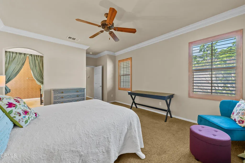 Welcome to Anacapa Walk — one of Port Hueneme’s most sought-after gated communities, where palm-lined streets lead to the beach and neighbors walk to the pier. This 3-bedroom, 4-bathroom home was one of the original model homes — and the upgrades show it.Arched hallways, crown molding, tile flooring, and a chandelier greet you at the door. The family room centers around a fireplace and built-in surround sound, with under-stair storage tucked neatly out of sight. The gourmet kitchen delivers granite countertops, mosaic tile backsplash, stainless steel appliances with a Bosch dishwasher, a center island with breakfast bar, and a separate dining nook.Upstairs, a loft with built-in speakers and a private balcony works beautifully as a media room, office, or retreat. The primary suite offers a travertine shower and built-in closet organization. Mirrored closet doors and ceiling fans in every bedroom, plantation shutters in the primary suite, and an included washer and dryer complete the upstairs.Out back, a built-in BBQ (natural gas or propane) and low-maintenance landscaping make for easy entertaining. The 2-car garage has epoxy floors, and the home is equipped with central A/C and a security system. Port Hueneme Beach Park, the pier, and Channel Islands Harbor are all minutes away.