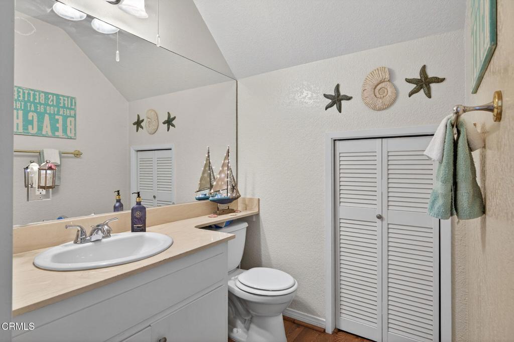 Welcome home to this beautiful two-story, 2-bedroom, 2-bath residence in the highly sought-after 55+ community of Hueneme Bay. Ideally situated in a prime central location, this sweet property overlooks the community’s scenic 9-hole pitch-and-putt golf course and is just steps away from the the pool, spa, and clubhouse–offering peaceful views and a tranquil setting.Inside, you’ll find a spacious living room with an adjoining dining area, highlighted by attractive wood-like flooring, stunning architectural arched doorways, and large sliding glass doors that open to your private patio–perfect for relaxing or entertaining while enjoying the serene surroundings. The galley kitchen has a new dishwasher, stainless steel deep sink with a farmhouse style faucet and a handy butcher block cabinet. This light filled kitchen is thoughtfully positioned to take in the beautiful golf course views, making meal prep a pleasure. There is a convenient 1/2 bath downstairs with additional storge cleverly located under the stairwell. Upstairs- The primary suite features a unique and versatile sitting room or dressing area–an exceptional bonus space rarely found. The generously sized upstairs bathroom offers dual sinks, new hardware and faucets and ample storage, combining comfort and functionality.The guest bedroom is also ample size and includes its own unique attic storage. Additional highlights include a one-car garage with an attached workshop, abundant extra storage, dual pane windows, new security front screen door, 1st. floor smooth ceilings and many thoughtful design details throughout that enhance everyday living.Enjoy resort-style living in a welcoming 55+ community close to beaches, shopping, and all that coastal living has to offer!