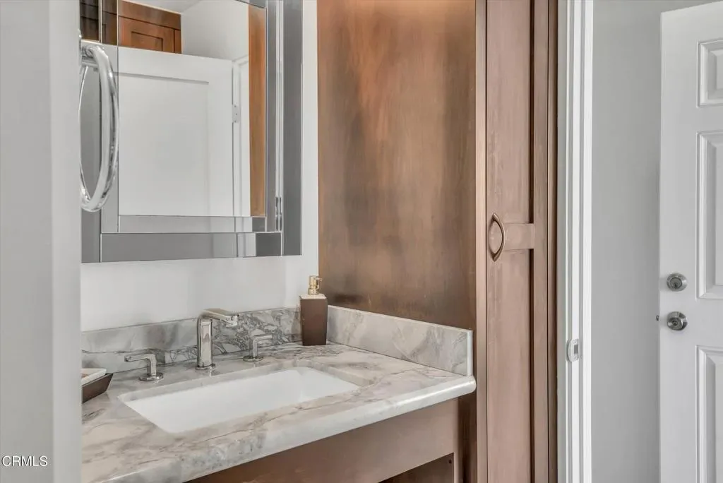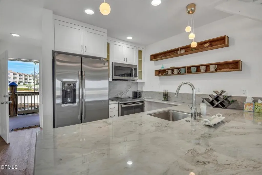 Experience coastal living at its finest in this stunning 2-bedroom, 1.75-bath, two-story condo located in the gated Surfside I community, directly across from the beach and pier in Port Hueneme. Completely upgraded from floor to ceiling, this one-of-a-kind home showcases tasteful, high-end finishes and breathtaking design throughout.From the moment you step through the front door, you are greeted with unobstructed 180-degree ocean views that immediately captivate. The main level features an open living and dining area with direct access to a private balcony, perfect for enjoying the ocean breeze and sunsets. The beautifully remodeled kitchen offers a huge peninsula, quartzite countertops, custom cabinetry, and stainless steel appliances, blending functionality with modern elegance. Also on the main level are a three-quarter bathroom with limestone tile on the floor and wall, marble on the countertop and shower wall enclosure, a dedicated laundry area with side-by-side front-loading side by side washer and dryer, and ample storage.Upstairs, you’ll find two bedrooms and a full bathroom featuring a jetted tub, limestone tile floor and tub wall, marble countertop and tub enclosure. The primary bedroom offers its own private balcony with sweeping ocean views, creating a serene retreat. The guest bedroom includes a separate private entry/exit, ideal for added flexibility.Additional highlights include bleached oak flooring throughout, mosaic marble flooring on both balcony decks, ceiling fans in the living room and both bedrooms, and a striking staircase with cable railing and custom glass steps that adds a modern architectural touch.This exceptional property combines luxury, comfort, and an unbeatable beachfront location–truly a rare opportunity to own a turnkey ocean-view condo.