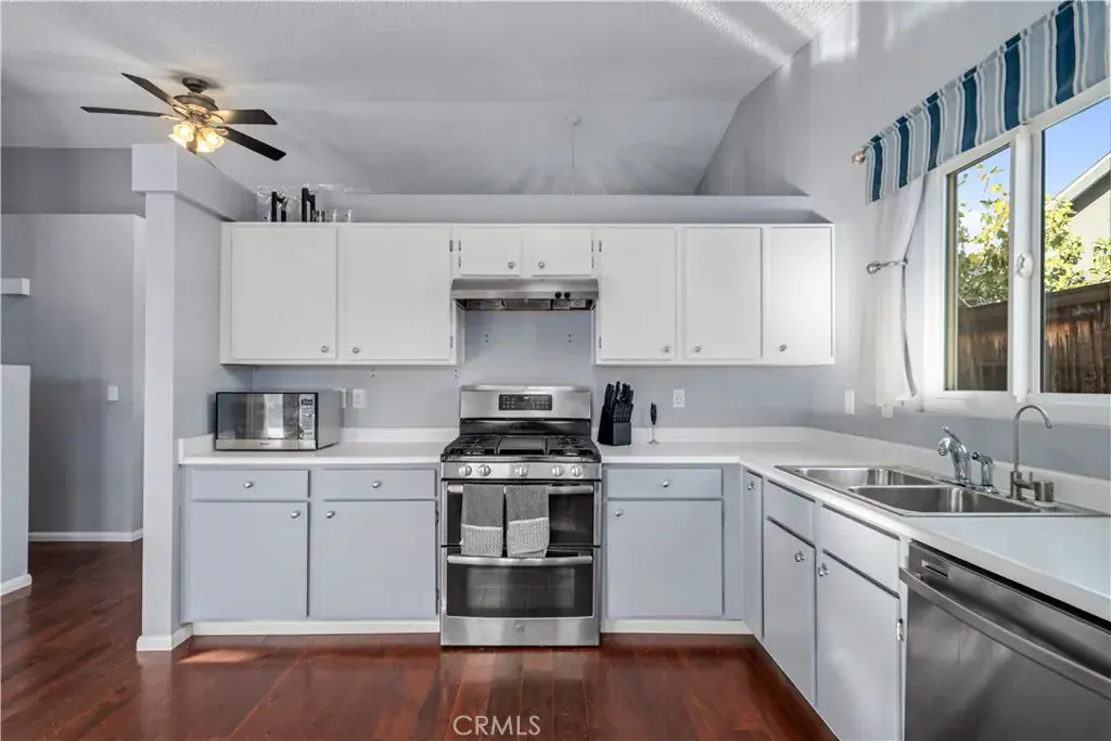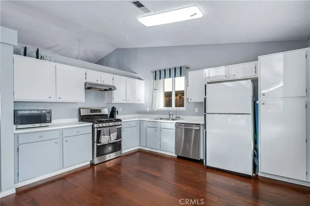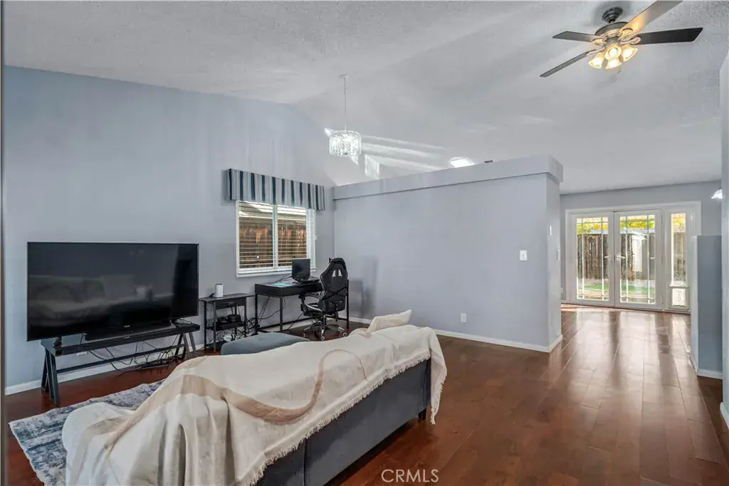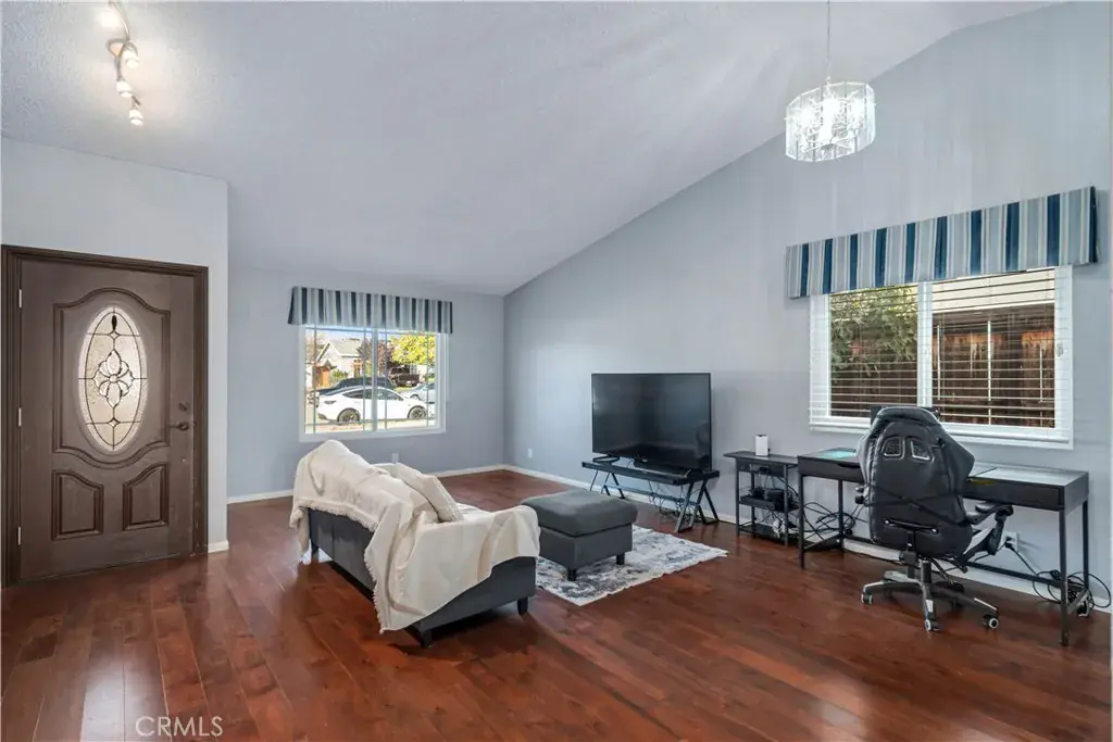 Welcome to the light-filled formal living and dining room, featuring vaulted ceilings, laminate wood flooring, and an attached 2-car garage with direct access. The open layout seamlessly transitions into a second living area, currently used as a dining room, which flows effortlessly into the upgraded kitchen. The kitchen boasts designer two-tone cabinetry, stainless steel appliances, a French door leading to the backyard, and a cozy fireplace with a marble-look surround.