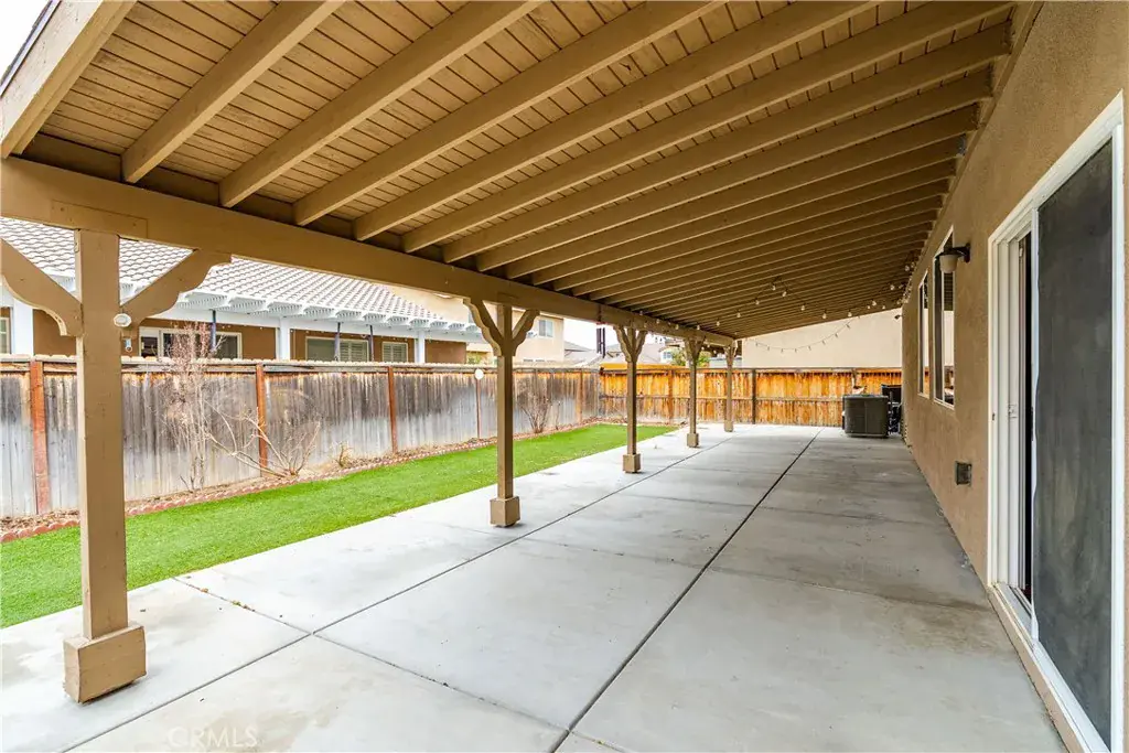 Step outside to your full-length covered patio—perfect for year-round entertaining—overlooking a low-maintenance yard with water-saving artificial turf.