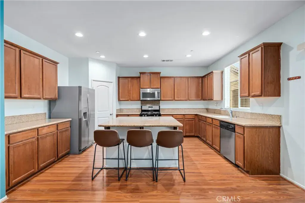 Downstairs features a large bedroom and full bath, ideal for guests or multi-generational living, plus a dedicated office with double-door entry at the front of the home. Enjoy both formal dining and a bright, open-concept kitchen with a center island, stainless steel appliances, walk-in pantry, and generous counter space—all flowing seamlessly into the expansive family room with tall ceilings.