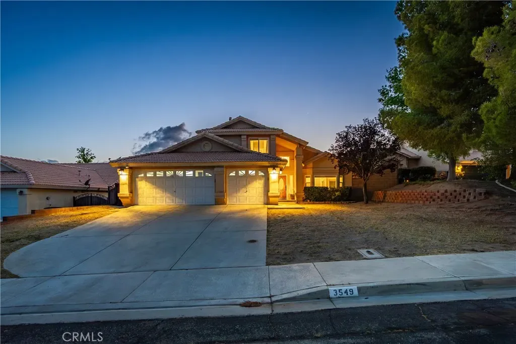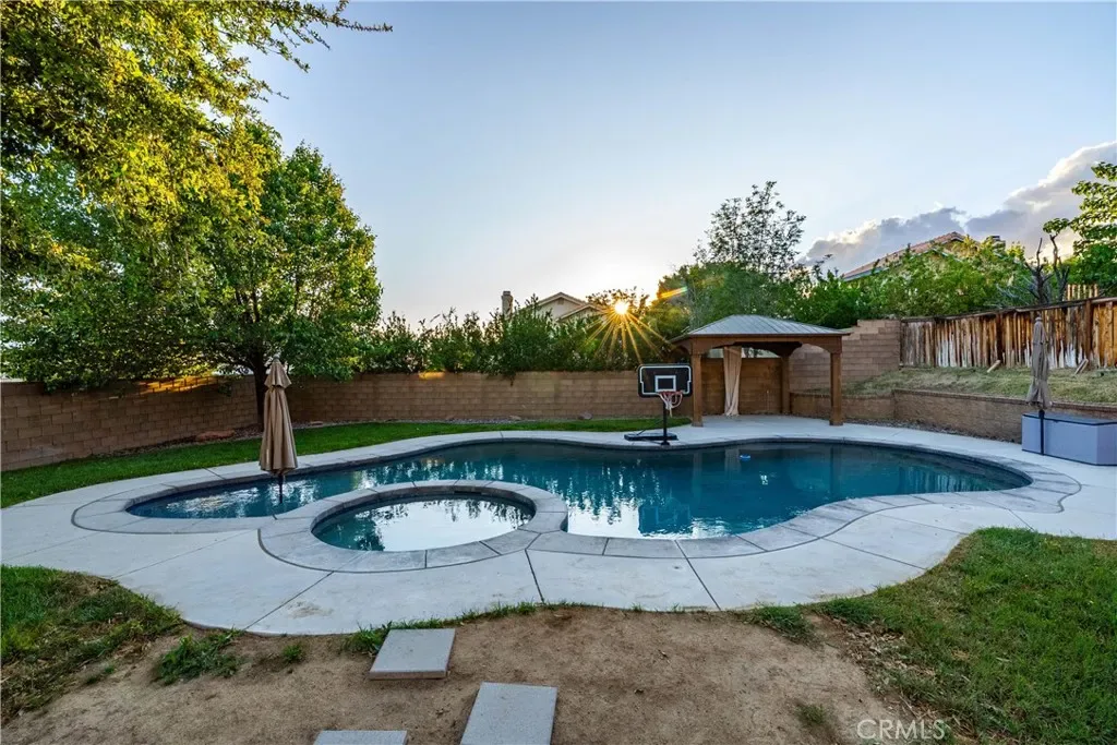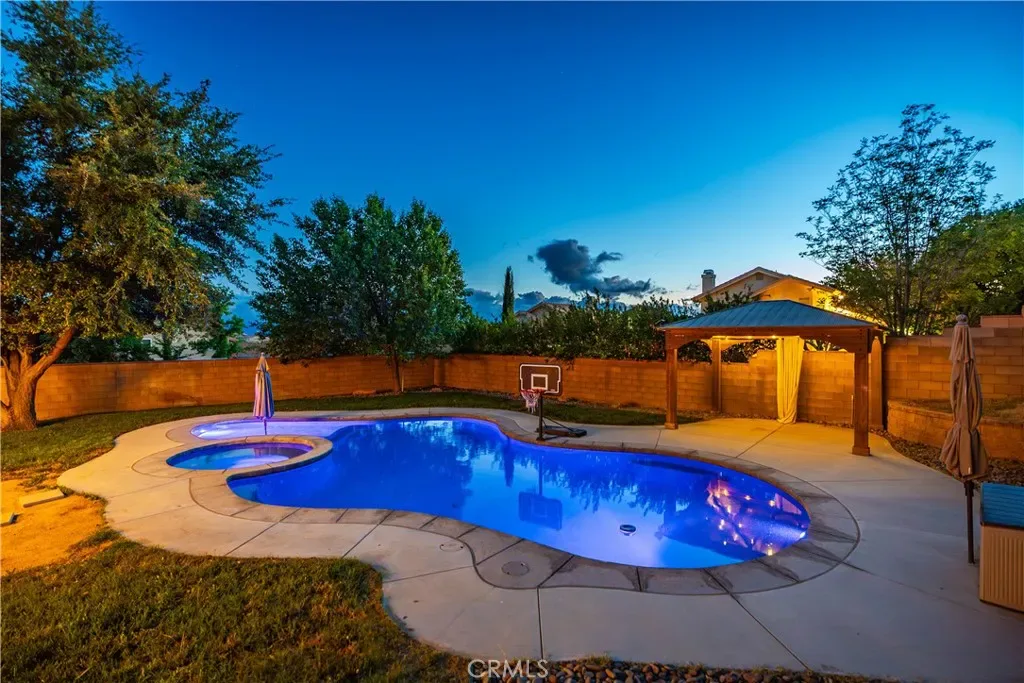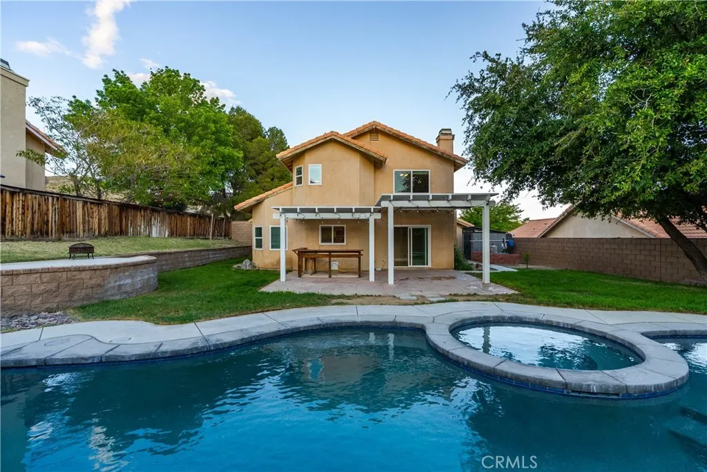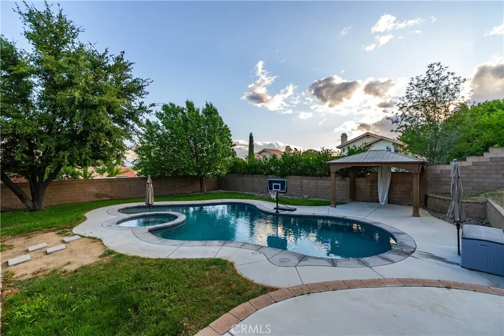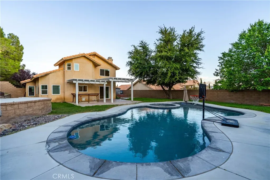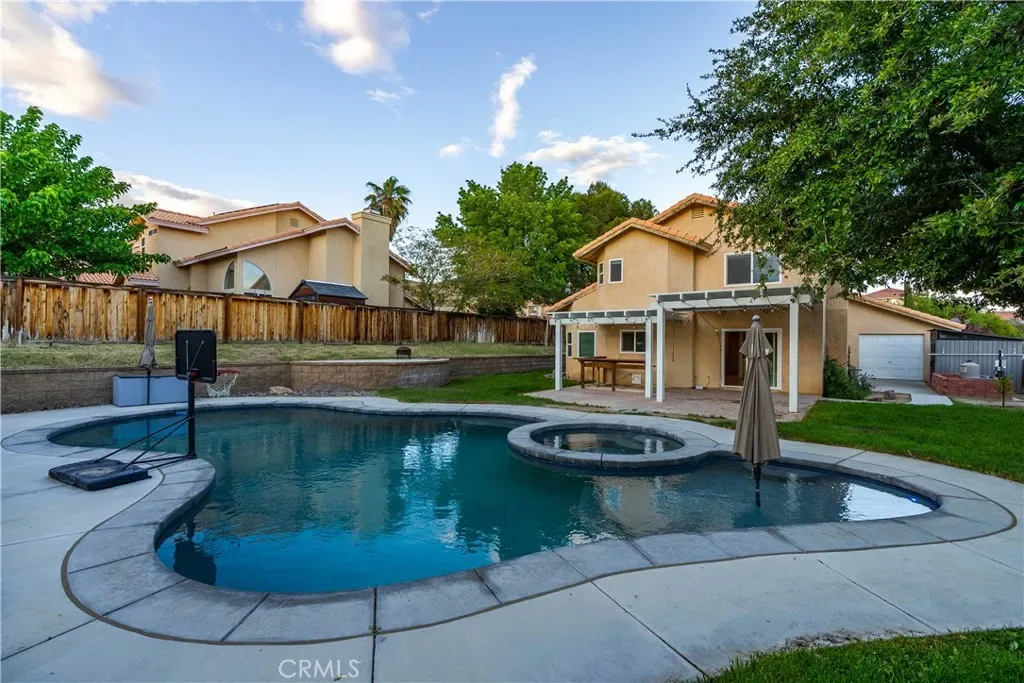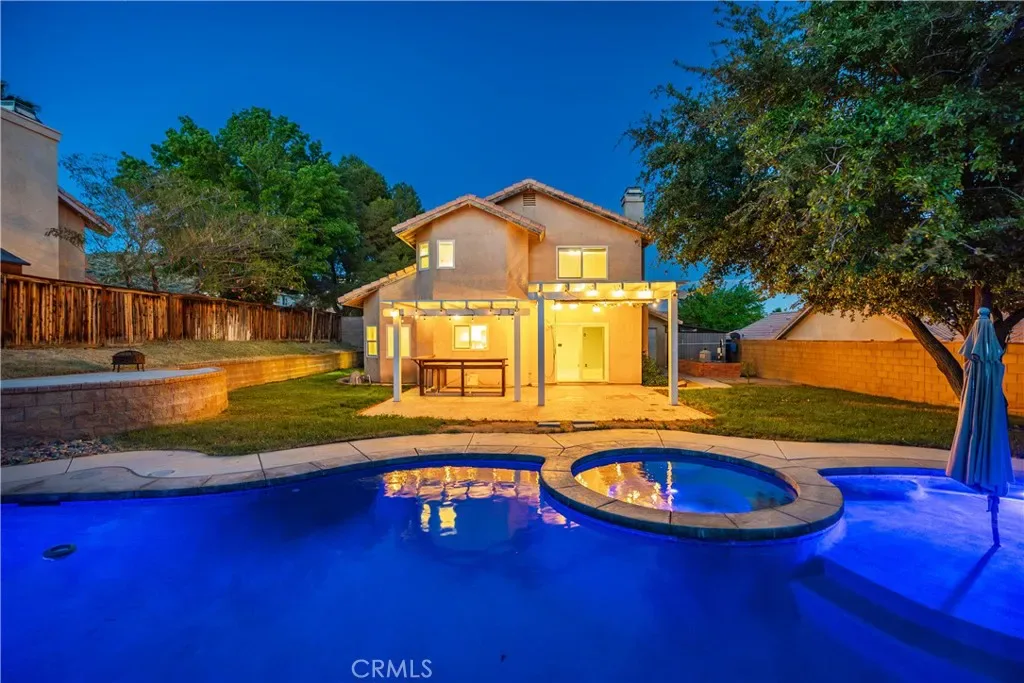 Welcome to this upgraded Rosamond two-story home w/ a pool & spa and a 3 car garage! Step inside to a grand entryway featuring soaring ceilings and a stunning chandelier, leading into a spacious formal living room with vaulted ceilings and an abundance of natural light. The family room offers a cozy fireplace, direct backyard access, and opens to the remodeled kitchen, creating an ideal space for everyday living and entertaining. The kitchen showcases quartz countertops, stainless steel appliances, a large center island, tray ceilings, and recessed lighting. Adjacent is a separate dining area with vaulted ceilings, modern chandelier lighting, and beautiful backyard views. Downstairs includes a full bedroom and bathroom, perfect for guests or multi-generational living, along with a laundry room featuring an upgraded barn door. Upstairs, the expansive primary suite offers a walk-in closet and a private bathroom with dual vanities, a large soaking tub, and a walk-in shower. Two additional bedrooms and another full bathroom complete the upper level. The backyard is an entertainer’s dream with a sparkling pool and spa, a cabana-style gazebo with lighting, a covered patio, and a spacious grassy area. Pool, spa, 3 car garage, and upgraded indoor and outdoor living make this home a standout!