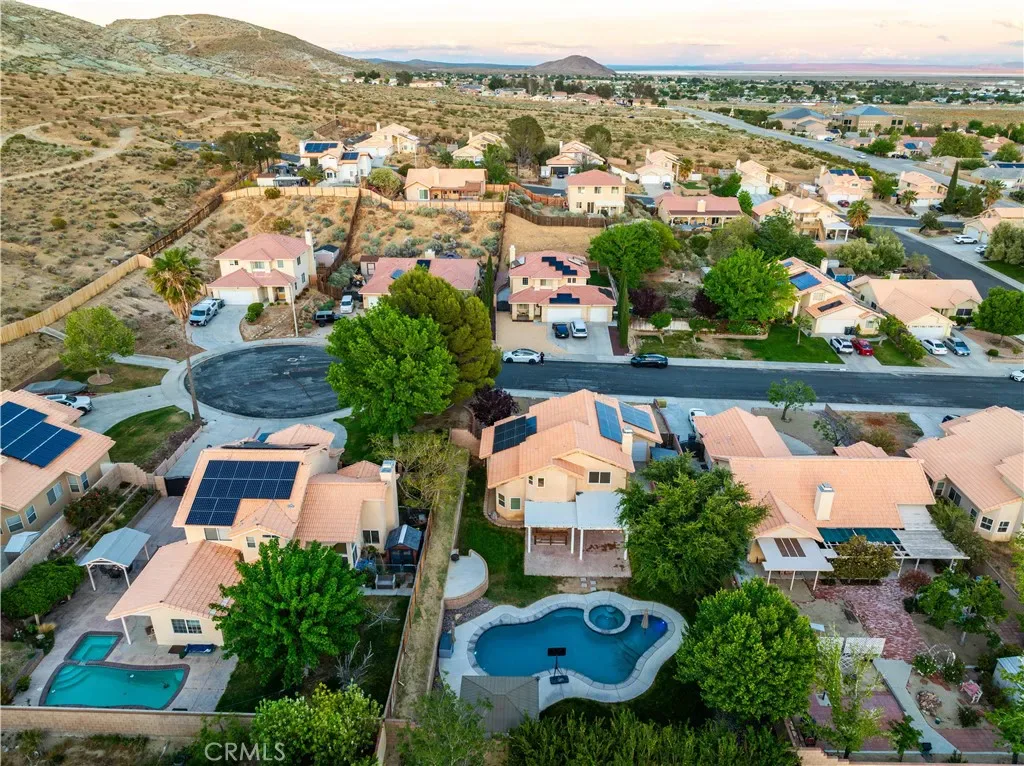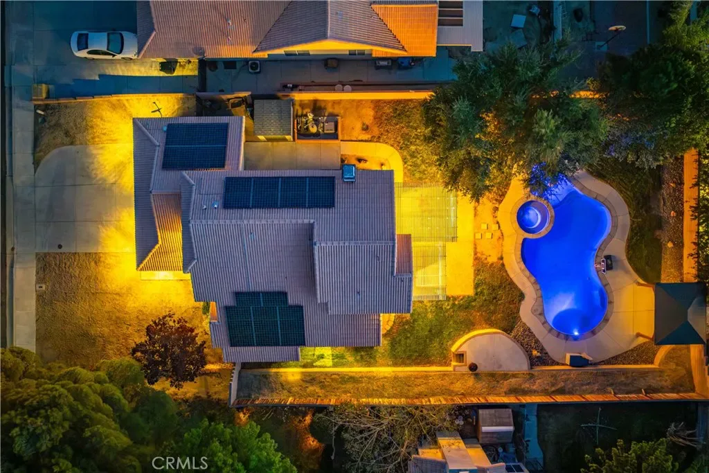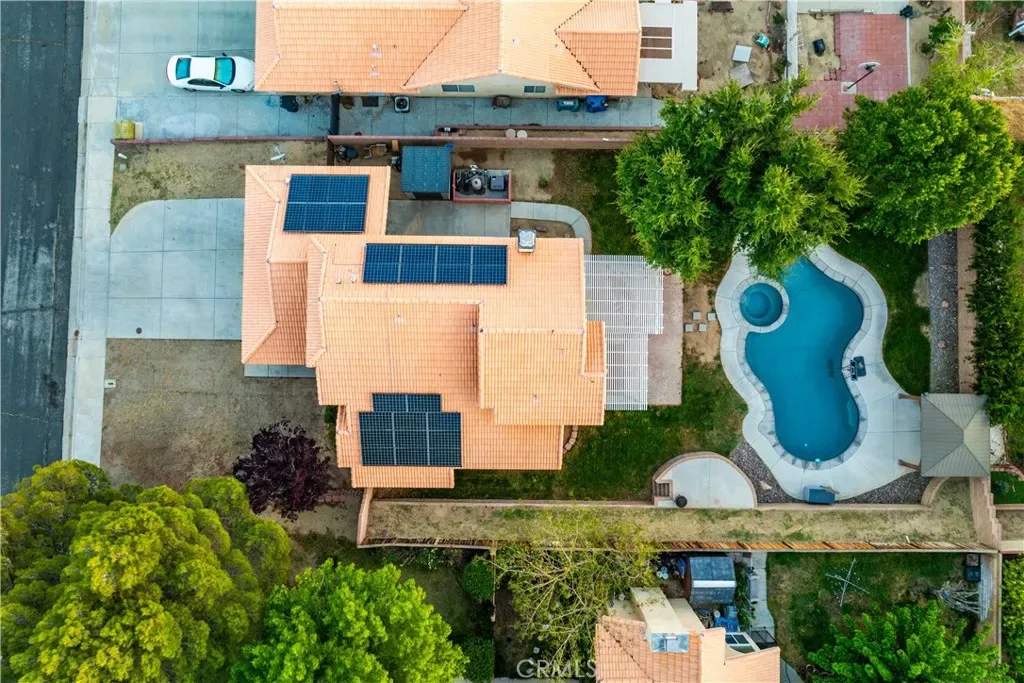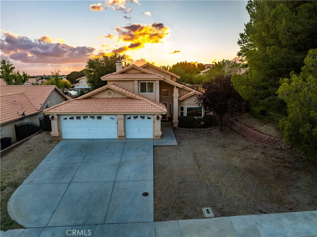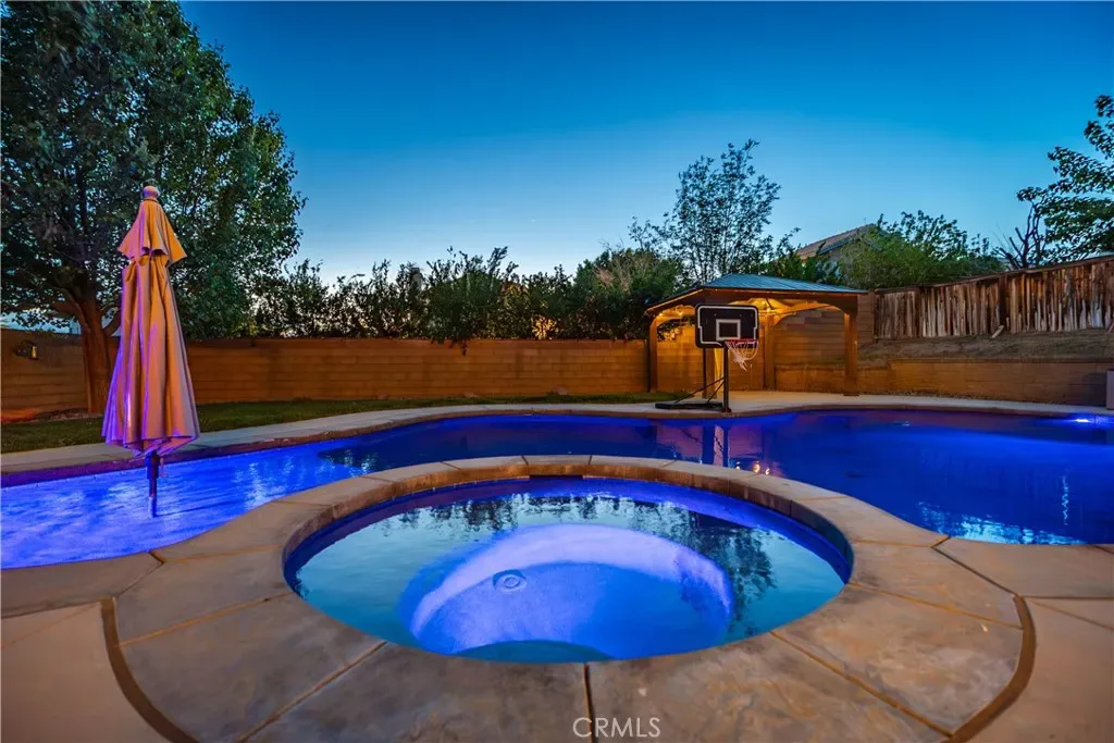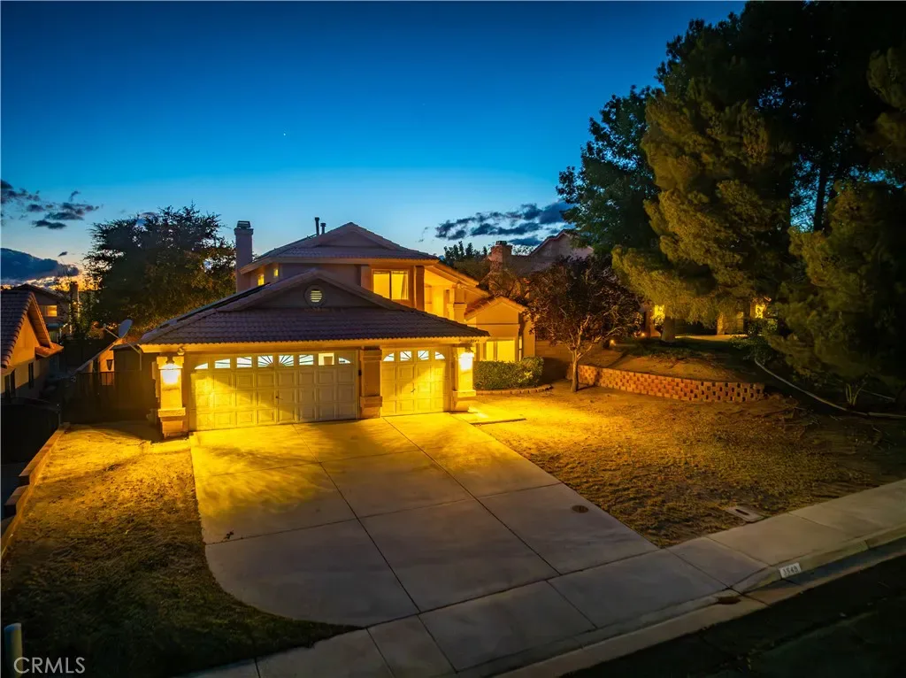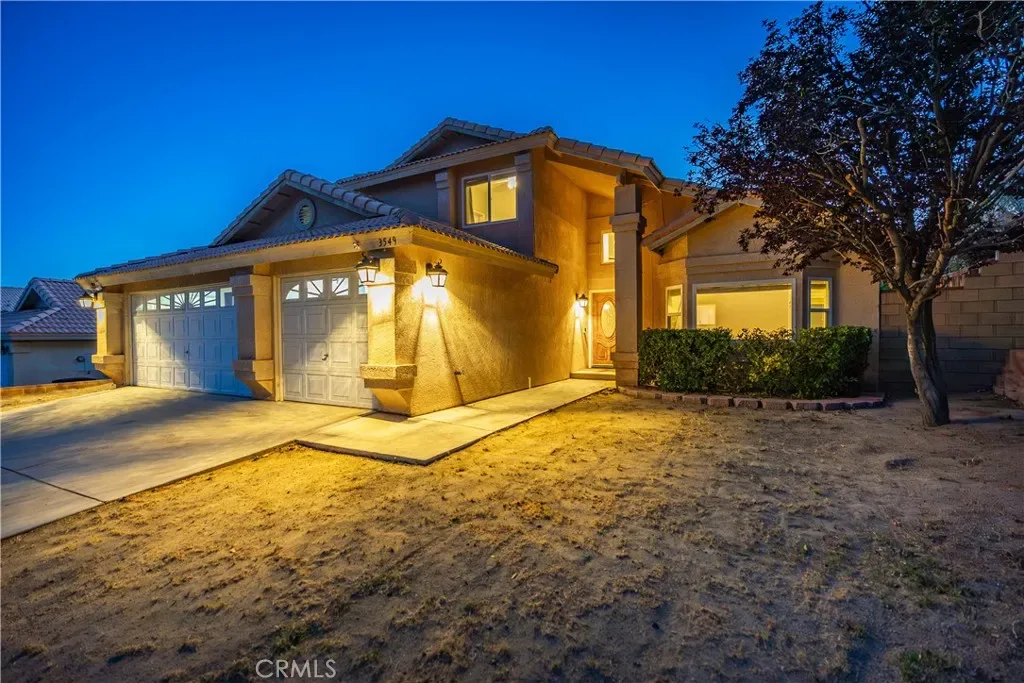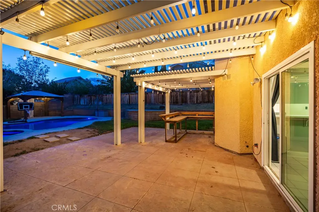 Welcome to this upgraded Rosamond two-story home w/ a pool & spa and a 3 car garage! Step inside to a grand entryway featuring soaring ceilings and a stunning chandelier, leading into a spacious formal living room with vaulted ceilings and an abundance of natural light. The family room offers a cozy fireplace, direct backyard access, and opens to the remodeled kitchen, creating an ideal space for everyday living and entertaining. The kitchen showcases quartz countertops, stainless steel appliances, a large center island, tray ceilings, and recessed lighting. Adjacent is a separate dining area with vaulted ceilings, modern chandelier lighting, and beautiful backyard views. Downstairs includes a full bedroom and bathroom, perfect for guests or multi-generational living, along with a laundry room featuring an upgraded barn door. Upstairs, the expansive primary suite offers a walk-in closet and a private bathroom with dual vanities, a large soaking tub, and a walk-in shower. Two additional bedrooms and another full bathroom complete the upper level. The backyard is an entertainer’s dream with a sparkling pool and spa, a cabana-style gazebo with lighting, a covered patio, and a spacious grassy area. Pool, spa, 3 car garage, and upgraded indoor and outdoor living make this home a standout!