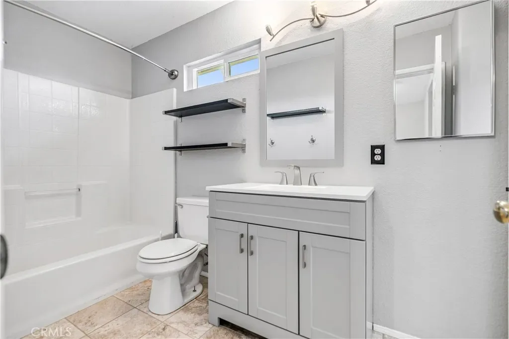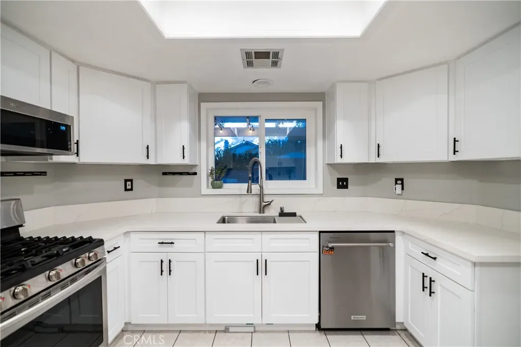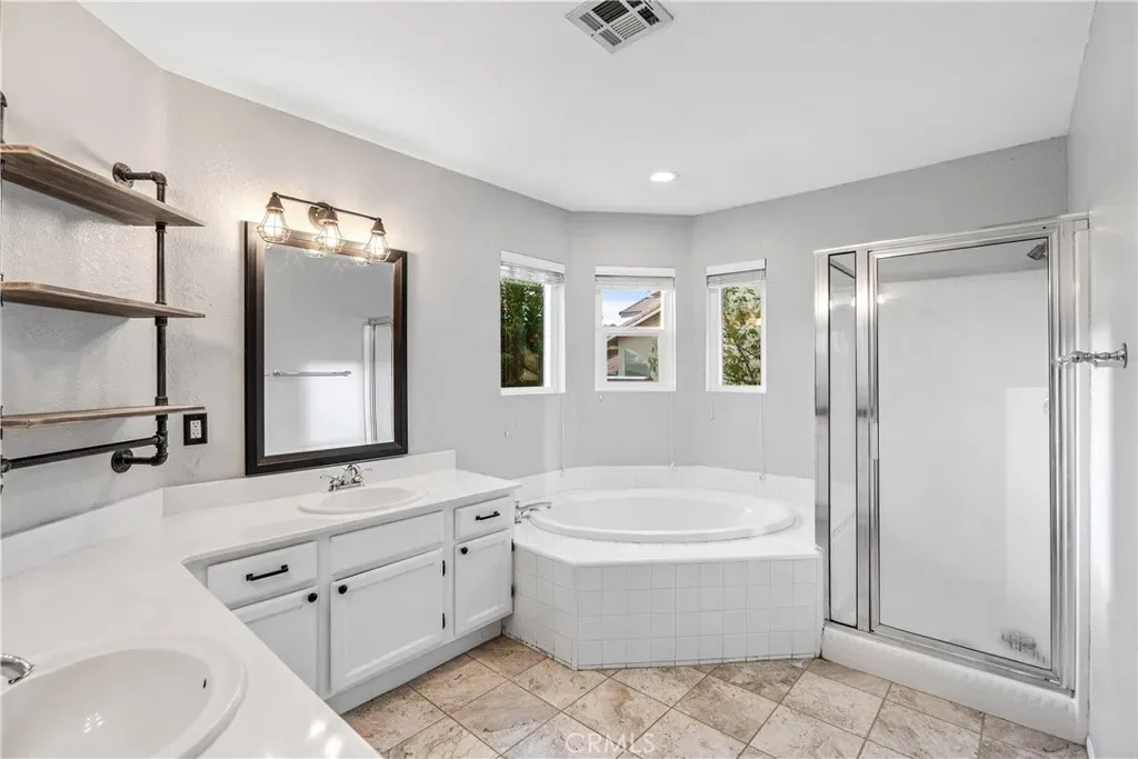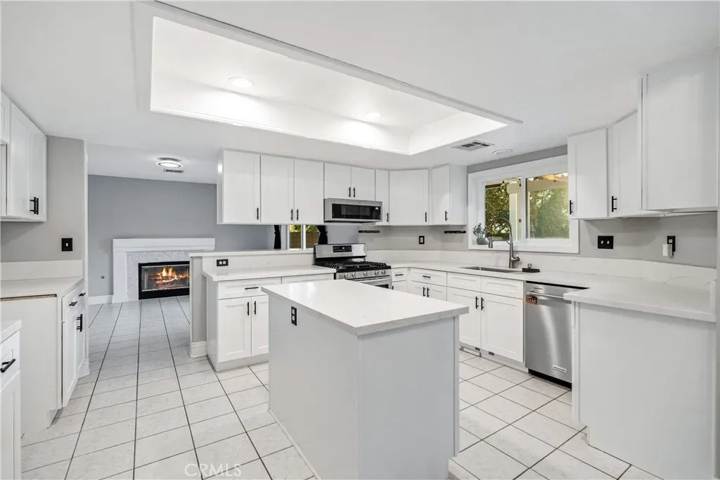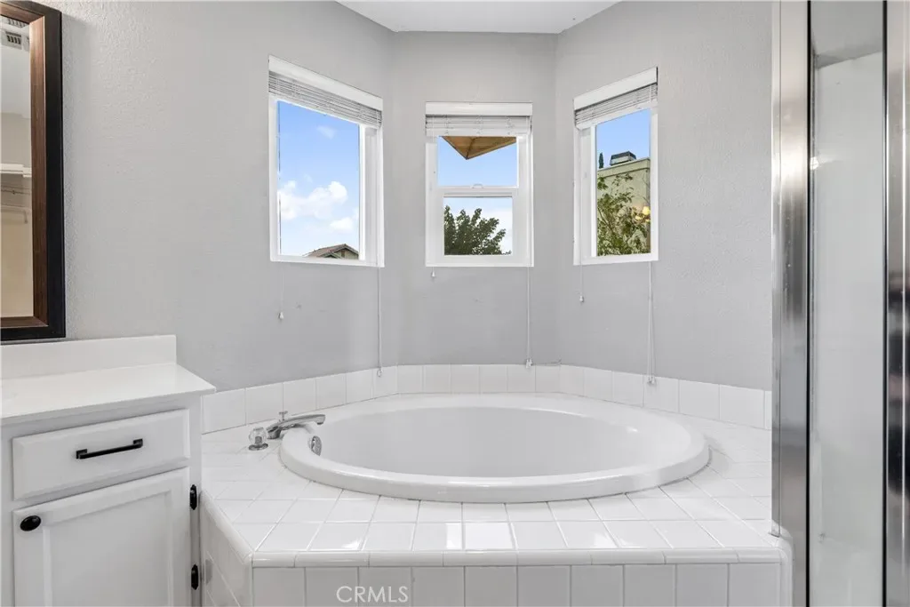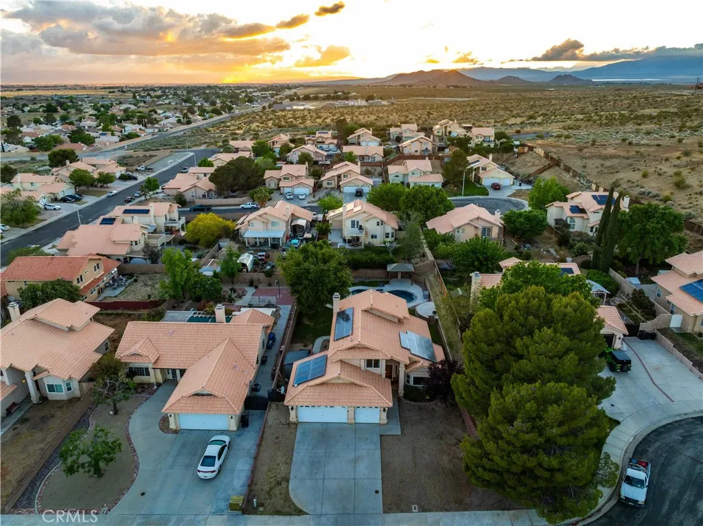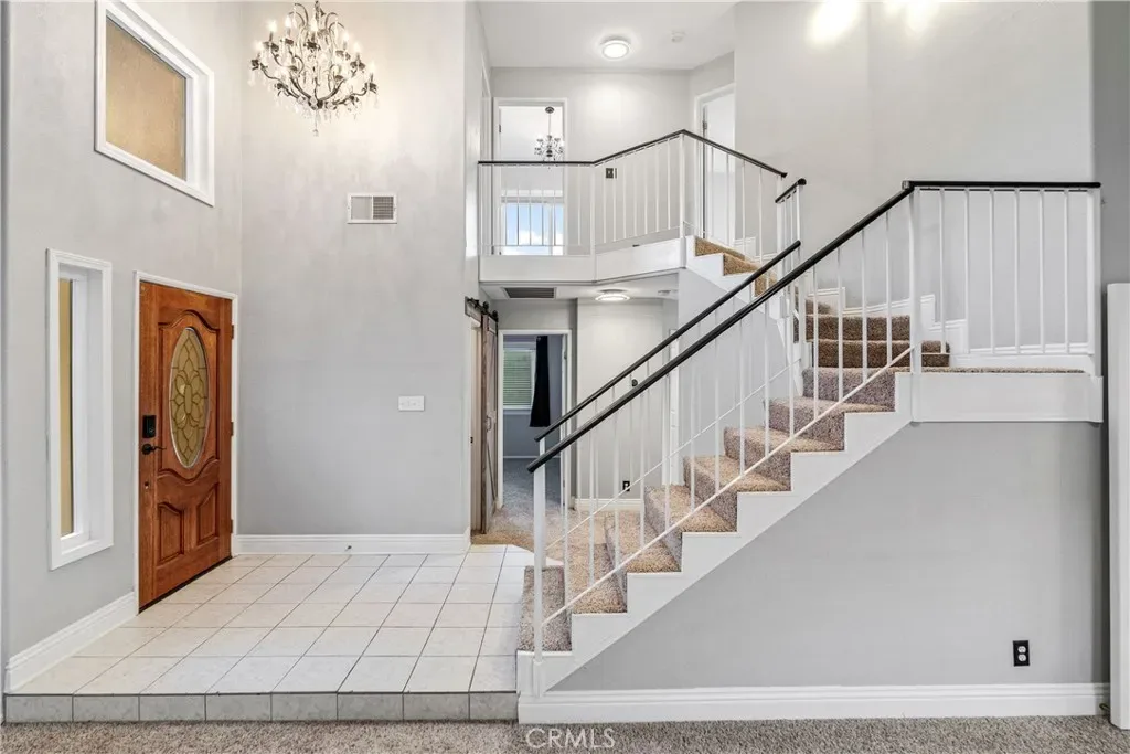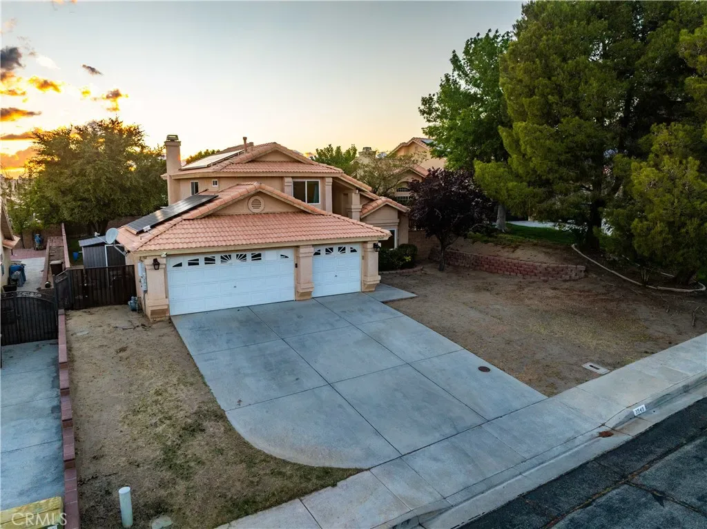 Welcome to this upgraded Rosamond two-story home w/ a pool & spa and a 3 car garage! Step inside to a grand entryway featuring soaring ceilings and a stunning chandelier, leading into a spacious formal living room with vaulted ceilings and an abundance of natural light. The family room offers a cozy fireplace, direct backyard access, and opens to the remodeled kitchen, creating an ideal space for everyday living and entertaining. The kitchen showcases quartz countertops, stainless steel appliances, a large center island, tray ceilings, and recessed lighting. Adjacent is a separate dining area with vaulted ceilings, modern chandelier lighting, and beautiful backyard views. Downstairs includes a full bedroom and bathroom, perfect for guests or multi-generational living, along with a laundry room featuring an upgraded barn door. Upstairs, the expansive primary suite offers a walk-in closet and a private bathroom with dual vanities, a large soaking tub, and a walk-in shower. Two additional bedrooms and another full bathroom complete the upper level. The backyard is an entertainer’s dream with a sparkling pool and spa, a cabana-style gazebo with lighting, a covered patio, and a spacious grassy area. Pool, spa, 3 car garage, and upgraded indoor and outdoor living make this home a standout!