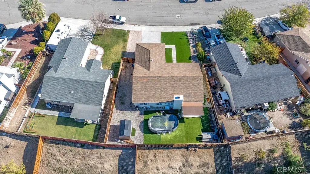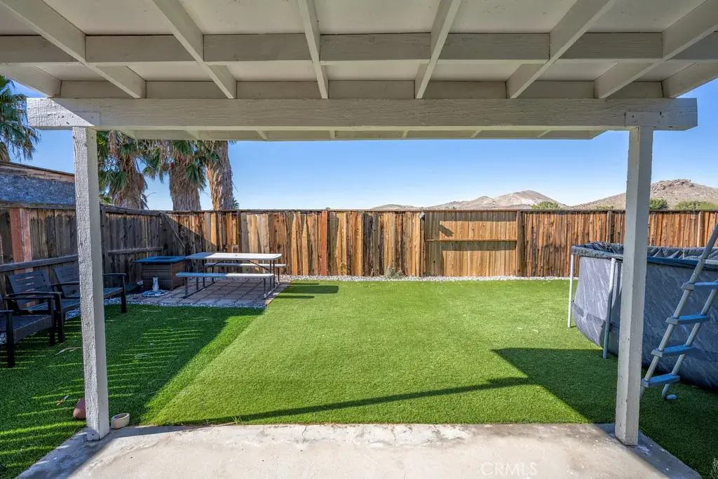 The backyard is your private escape, featuring a shaded patio cover perfect for outdoor dining, an above-ground pool for summer fun, and a storage shed—all included with the property.