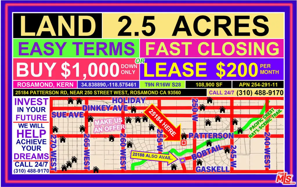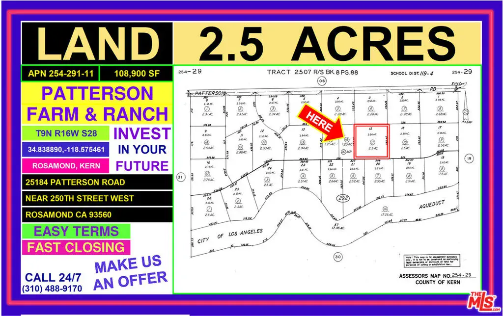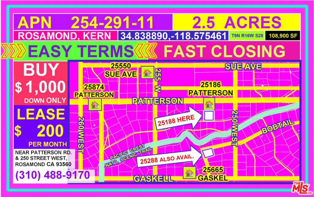 - Located in the TRACT 2507, LOT 15, RECORD OF SURVEY (R/S) BK 8, P subdivision, 25014 W PATTERSON RD Rosamond CA is a Land for sale in Rosamond, CA, 93560. It is listed for $19,990 and features 3 acres. To schedule a showing of MLS#24355045 at 25014 W PATTERSON RD in Rosamond, CA, contact your Outland and Associates / JoAnn Outland agent at 8054417754.