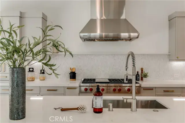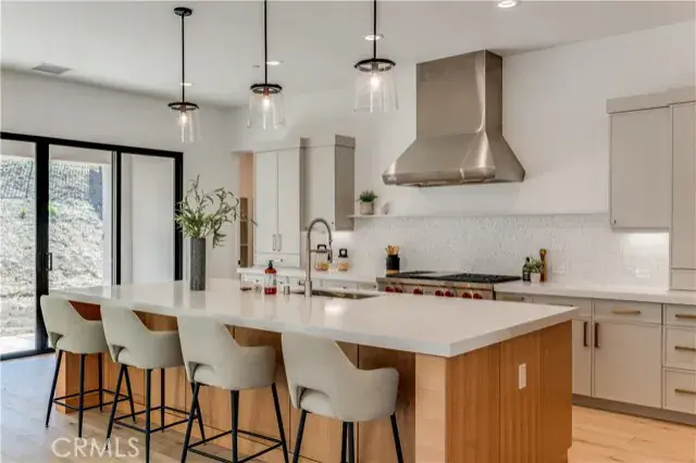 The Gourmet kitchen is a chef’s delight, with modern-style Rift Oak flat panel cabinetry, Revera Calacatta Vintage quartz countertops, and a Honed Marble Mosaic backsplash. It also includes a Wolf range-top Appliance package and a Subzero under-counter beverage center.
