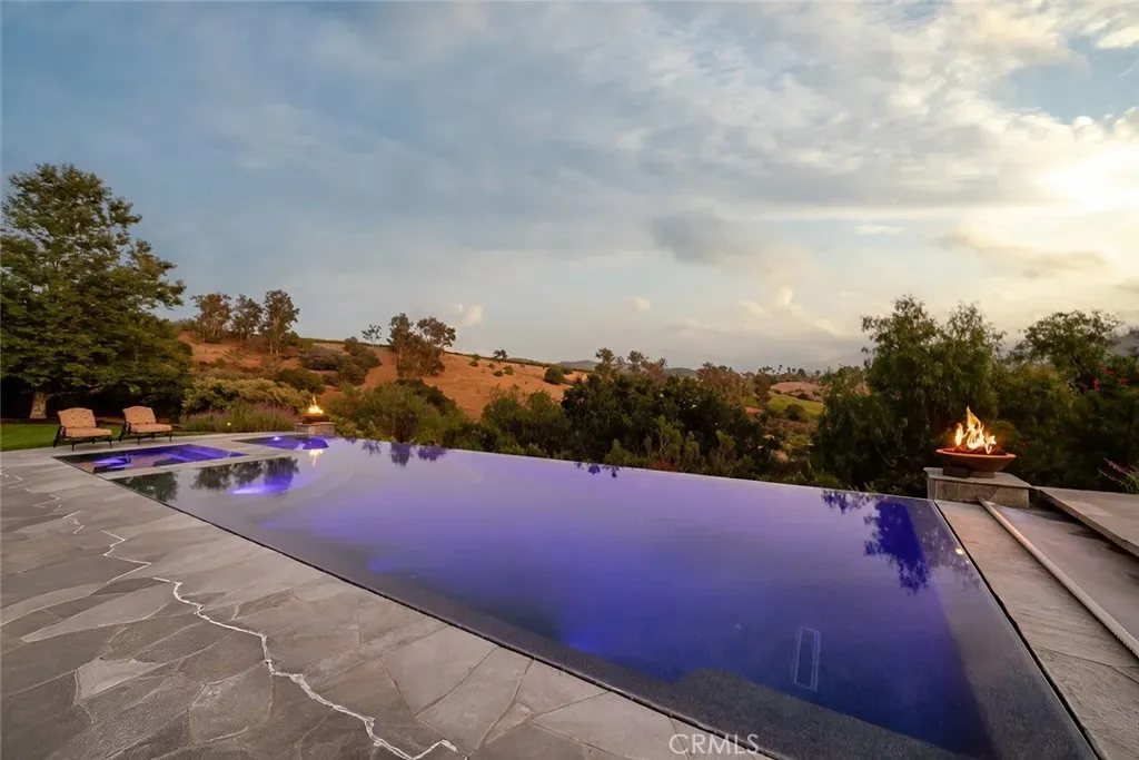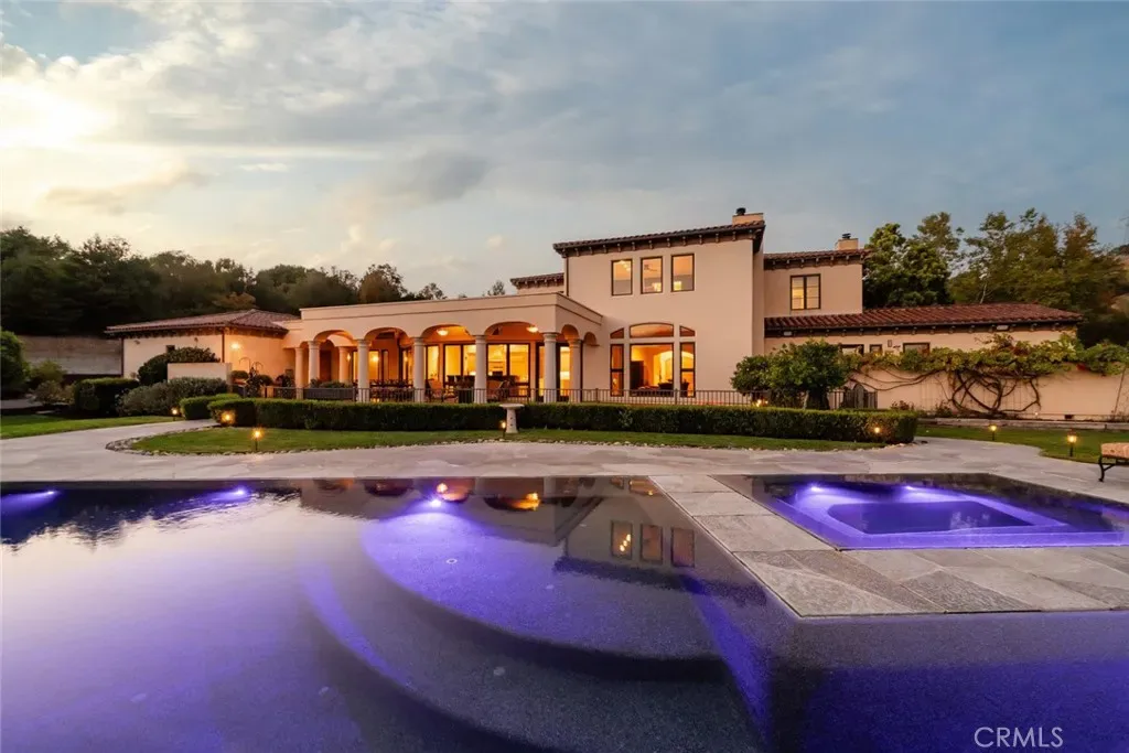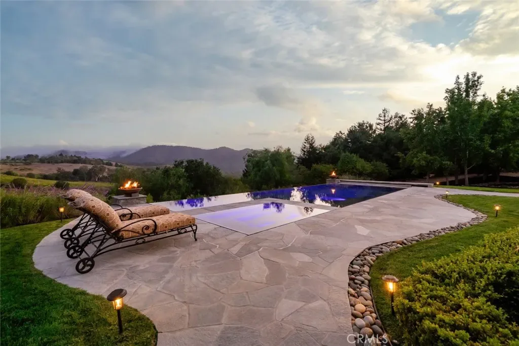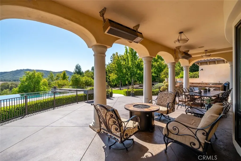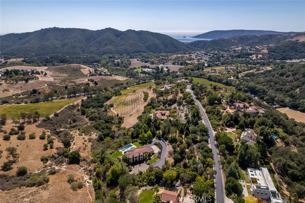 Tucked behind the gates of Bassi Ranch in the serene Avila Valley, this extraordinary property combines privacy, luxury, and timeless Tuscan-inspired architecture. Entering the gated community and turning down the private driveway, the remarkable views are sure to capture your attention. The property is recessed below street level, the residence is hidden from view, offering privacy while framing sweeping views. The home sits on a 3-acre parcel. The home has exquisite amenities such as pre-paid solar and battery a backup system, infinity edge pool, fully landscaped and a spacious 4 car garage. A grand motor courtyard welcomes guests with room for over 14 vehicles. The custom floor plan provides the primary suite, a large office, a guest suite accessing the large, secluded courtyard and all living areas on the entry level to provide easy living. The house offers an extravagant entry with two story ceilings. The living room provides grand ceilings with wood beams and sprawling views of the valley and rolling hills. It also includes a wood burning fireplace and surround sound. The chef’s kitchen, designed for both function and beauty, has dual islands, double ovens, two sinks, two dishwashers, striking marble countertops, and space for everyone to cook and congregate together. The kitchen has beautiful picture windows overlooking the scenic Avila Valley and infinity pool which showcases two fire pits, speakers and ambient lighting. The kitchen and living room flow out into the back yard, where the heated infinity pool and spa overlook the horizon and surrounding valley views. The outdoor patio includes a built-in BBQ and sink. The partially covered patio area has built-in heaters. The primary suite is a sanctuary with an adjoining office, a large walk-in closet, and a spa-worthy bathroom. The shower features triple shower heads and a built-in bench. The primary bedroom leads to a private outdoor patio, adjacent to the pool and back yard. The spacious dining room is adjacent to the kitchen and opens to the private side patio. Upstairs provides a large den with sweeping views and two large storage rooms. It also has a deck to relax or greet your visitors. The two wings on the upper-level offer 4 total bedrooms and 2 guest bathrooms designed in a jack and jill orientation for ease and convenience. This estate offers true elegance and showcases the essence of luxury living.