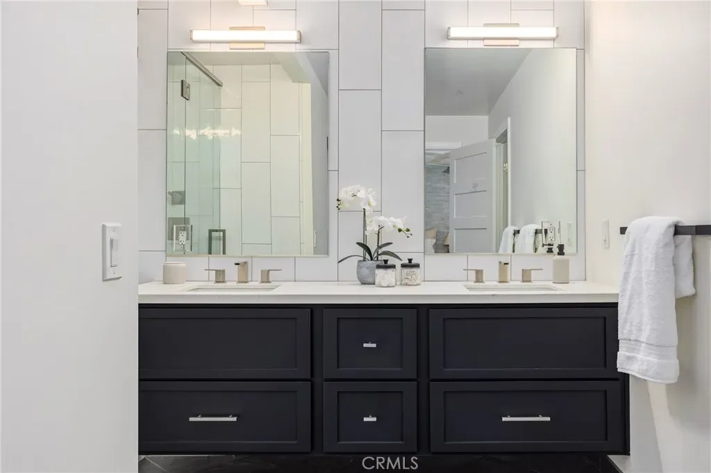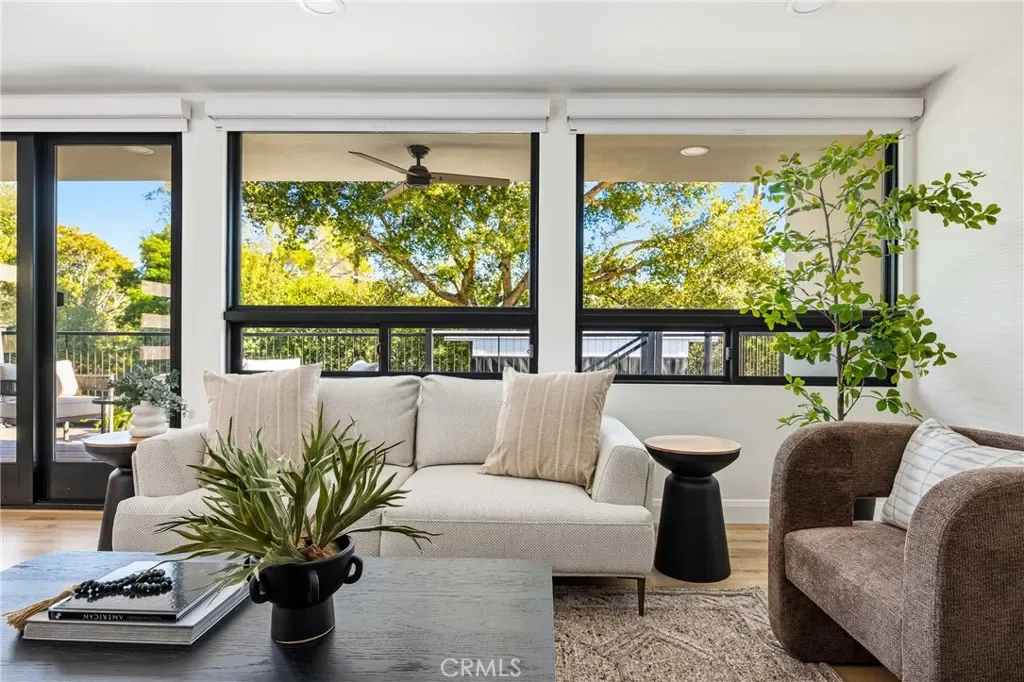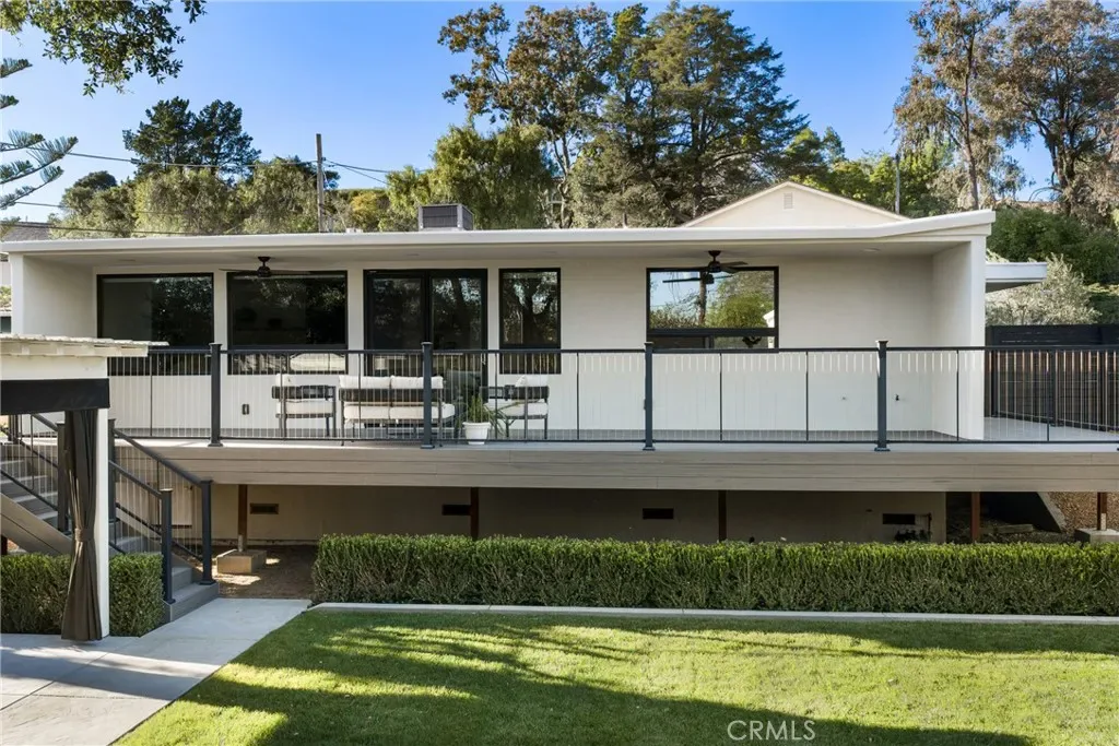 Hillside views and contemporary architecture set the tone for this single-level home near Sinsheimer Park. A breezeway entry between the home and detached two-car garage creates a striking architectural approach to the front door. Inside, oversized doors and windows fill the interior with natural light while framing hillside views. Anchoring the living room is a dramatic slate fireplace wall with floating wood shelves and wide plank flooring. The kitchen includes Viking appliances, quartz countertops, and an eat-in dining area that connects with the main gathering spaces. Wide hallways and large windows lead to the bedroom wing. The spacious primary suite opens to a private patio with a sauna. Its bathroom includes slate flooring, dual vanities, a glass-enclosed shower, and a walk-in closet. Two additional bedrooms share a nearby full bathroom with dual vanities and ample storage. Set on an expansive 11,500± sq. ft. parcel, an elevated deck spans the length of the home and captures hillside views. Below, a covered patio includes the spa and overlooks the landscaped yard. This area is planted with mature olive trees, a small citrus orchard, and a rose garden. The garage is finished with epoxy flooring and includes an attached storage room. Elevated views, layered outdoor spaces, and distinctive architecture come together to create a home that feels both private and connected to its surroundings.