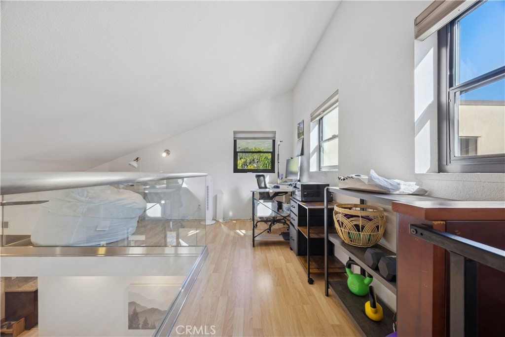 Elegantly updated 1-bedroom, 1-bath residence featuring a versatile loft and an attached single-car garage, offering a refined blend of style, comfort, and functionality. Thoughtful upgrades include stainless steel appliances, granite countertops, and multiple skylights that bathe the interior in natural light. Privately positioned behind a secluded gate and accessed via a dedicated staircase, the home enjoys a quiet, exclusive setting removed from the main walkway. The open-concept layout effortlessly connects the living, dining, and kitchen spaces, creating an inviting environment ideal for both everyday living and sophisticated entertaining. A striking spiral staircase rises from the living room to a loft area—ideal for a home office, den, or additional storage—while the private balcony captures pleasing views and provides a serene retreat, perfect for morning coffee or unwinding at sunset. The generously sized bedroom is filled with natural light, complemented by exceptional storage throughout the residence. Multiple interior closets provide ample space, while a conveniently located exterior closet beneath the staircase offers additional, rarely found storage. The well-appointed bathroom is intelligently designed with pocket doors and dual vanities, allowing it to function as an en suite while maintaining privacy and convenient access from the main living area. The attached garage adds further versatility, with a deep layout accommodating multiple shelving units in addition to parking, and is complemented by additional guest parking throughout the community. Recent enhancements include a newly constructed exterior staircase, an updated deck, and a new lower patio. Ideally situated in one of San Luis Obispo’s most desirable neighborhoods, just moments from the Jennifer Street Bridge, this residence provides effortless access to downtown, as well as close proximity to the Terrace Hill Loop and the SLO Railroad walking and biking path—delivering an exceptional lifestyle in a premier location.