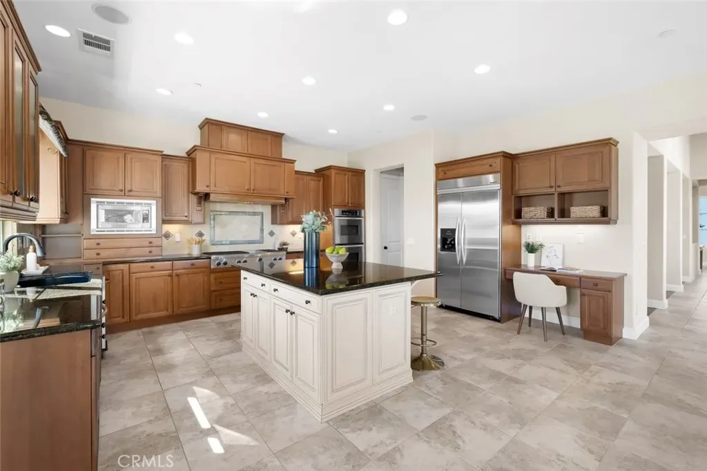The living room blends warmth and grandeur with a cozy fireplace and seamless connection to the expansive kitchen with abundant cabinetry, a spacious center island, stainless steel appliances, and a walk-in pantry create a true culinary haven.
