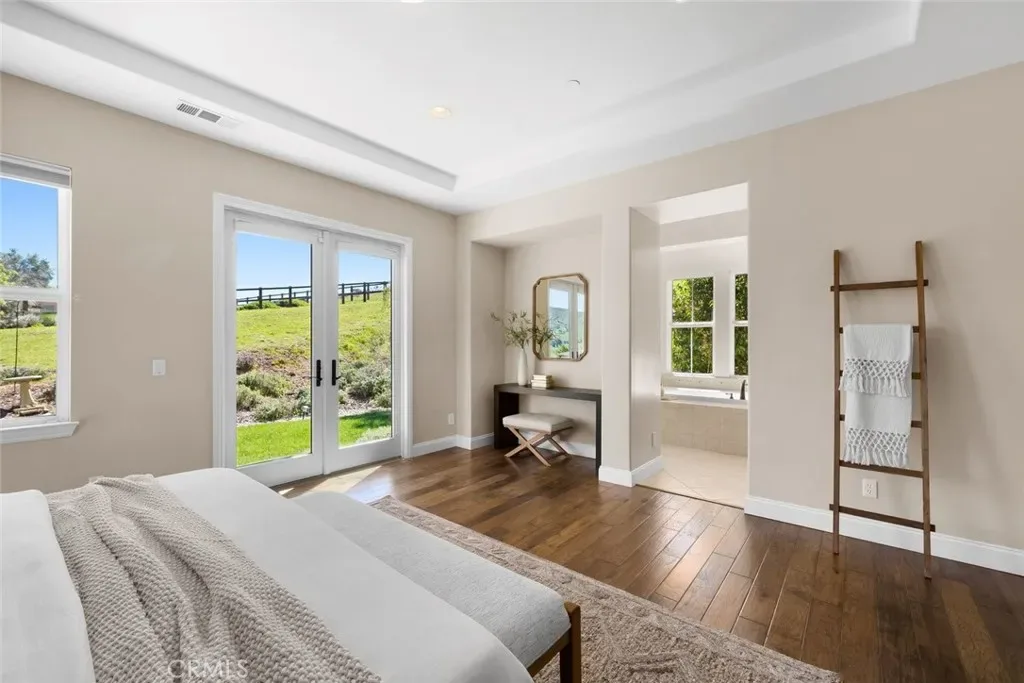 Upstairs, a truly exceptional private suite offers flexibility for guests, multi-generational living, or a luxurious retreat. With both interior access and a separate entrance from the stunning balcony, this space showcases panoramic views of the surrounding peaks and hills. Boasting a spacious sitting area, wet bar with refrigerator, spa-like ensuite bath with copper fixtures, dual vanities, a wet room with soaking tub overlooking the scenery, and not one, but two, walk-in closets.